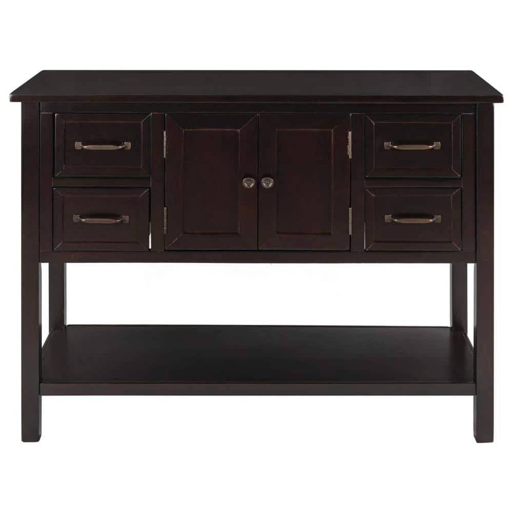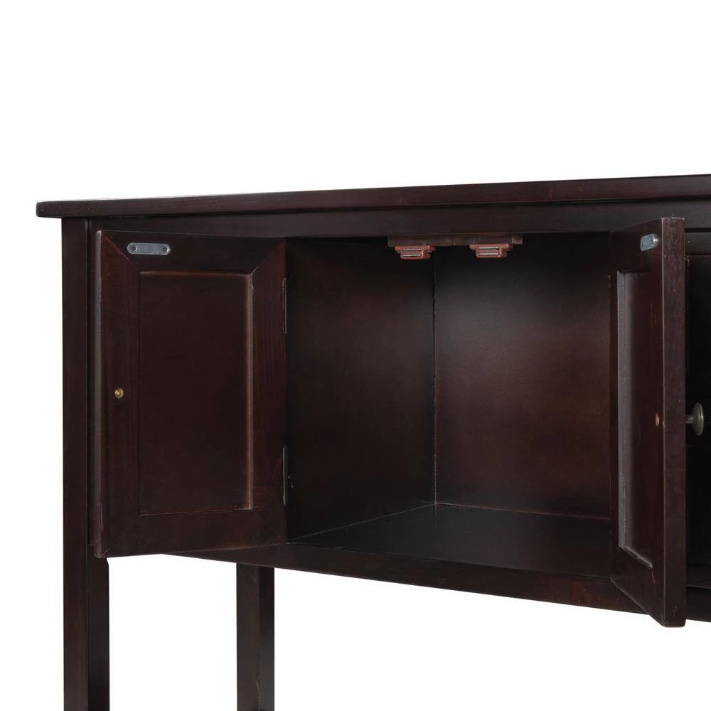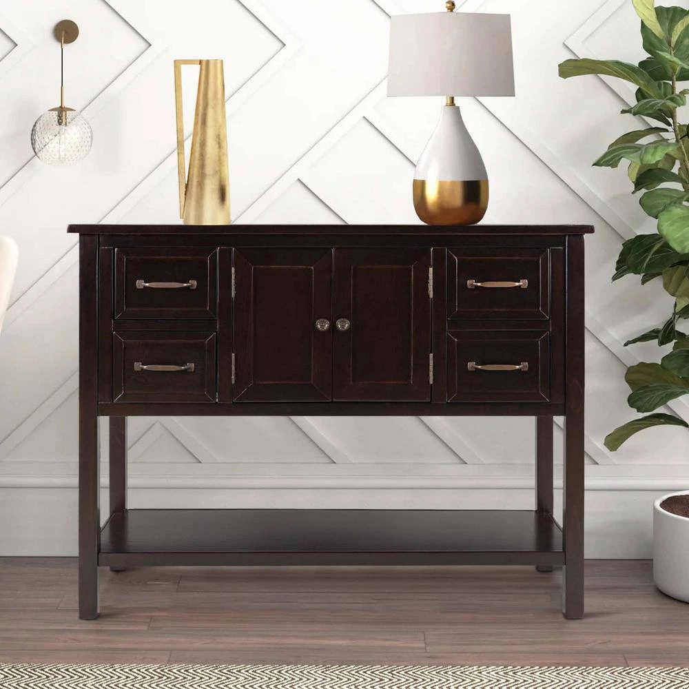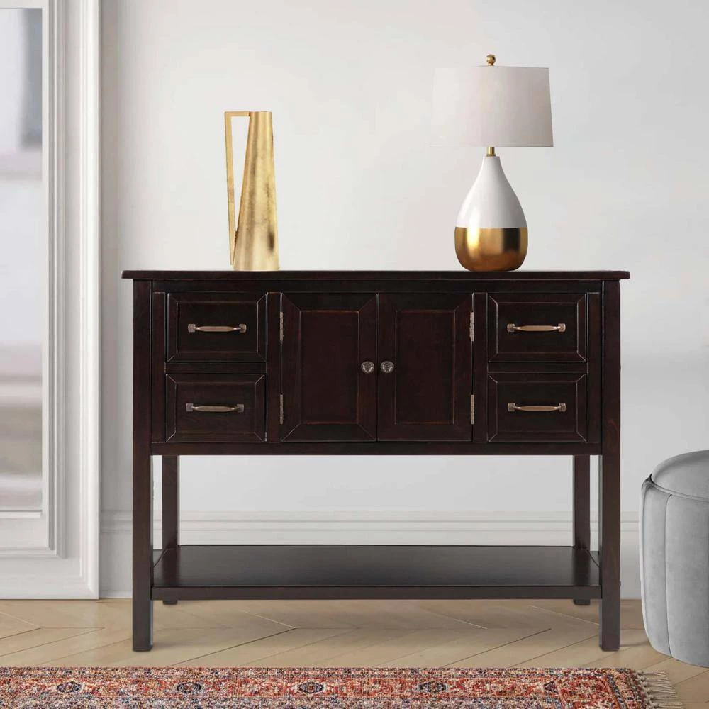 This console table has a classic vintage look with 4-drawers, 1-cupboard and 1-shelf, and plenty of storage space to give you plenty of storage. You can store and place items however you want, saving a lot of extra space. Stylish colors add more glamour to the console. Mainly made of solid pine and faux wood, it is structurally stable and durable. Also, it has a good load-bearing capacity. Good materials and unique storage design make this console table ideal for you.