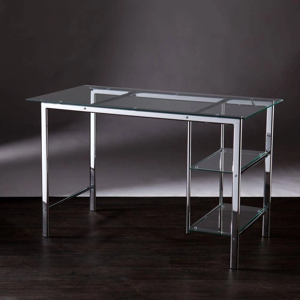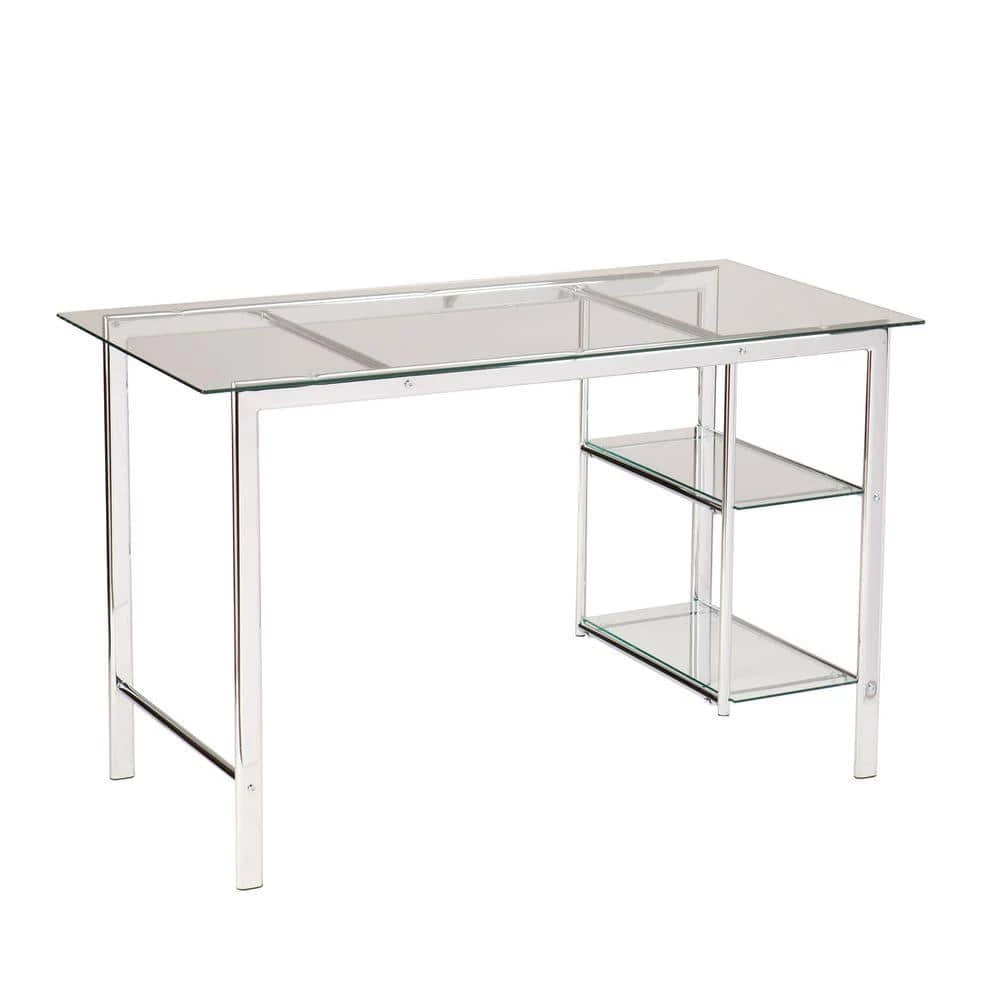 Raise your home office style to an iconic level with this stunning glass desk. Pristinely paired frameless glass and airy, chrome architecture form a minimalistic design that effortlessly opens up small spaces or works comfortably in roomy places. Suspended glass shelving adds an element of intrigue to organizing office necessities and decor while the sleek glass desktop doubles as a giant dry erase board. In the home office, entry or living room, this ultra-contemporary desk is a streamlined solution for success.