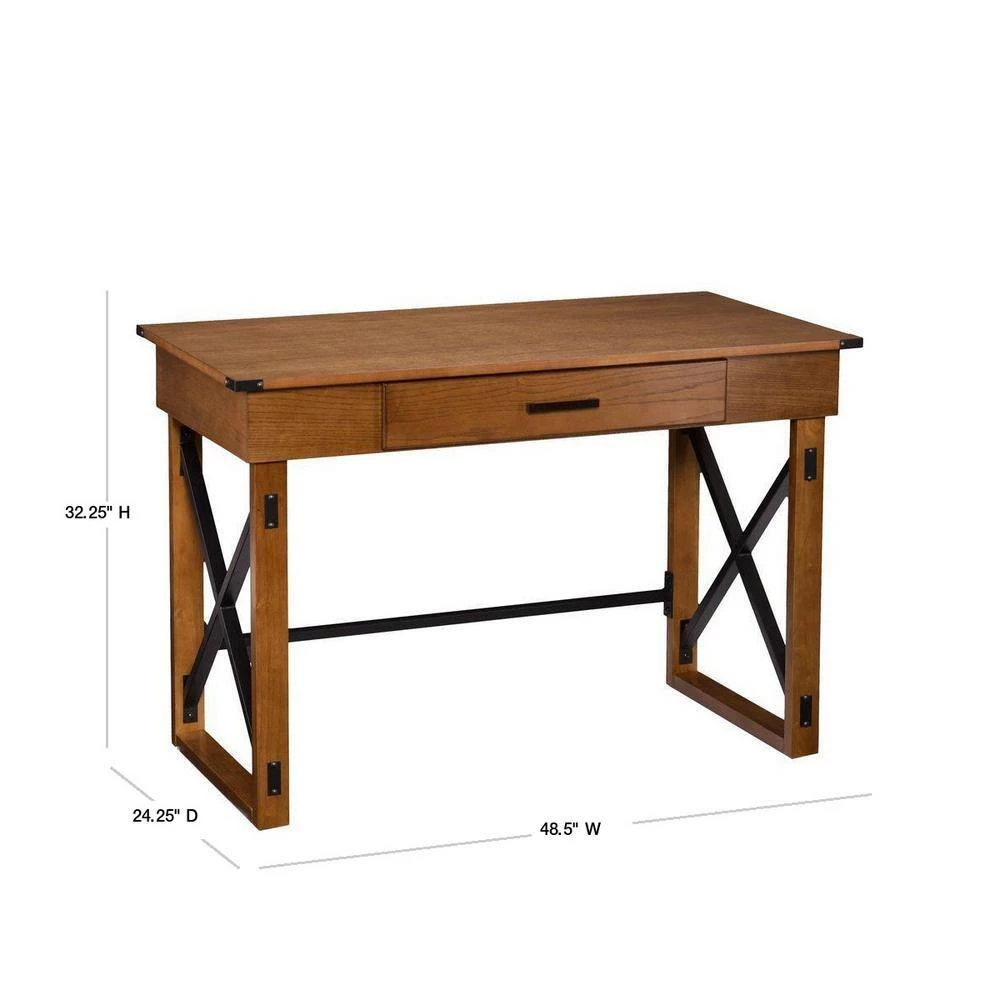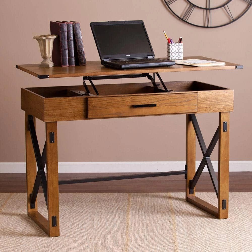 Loft your home office up, and away with this decidedly different, lift-top desk. Hidden office storage appears with the gentle lift of the spacious writing surface, going from sitting to standing in seconds. Distressed pine finish and smooth black metal evoke industrial appeal with a soft farmhouse touch, while designedly frame and exposed rivets hit the nail on the head of style. Wield in the home office for a rustically refined workspace or work into the kitchen for a unique extra surface that adjusts with you.