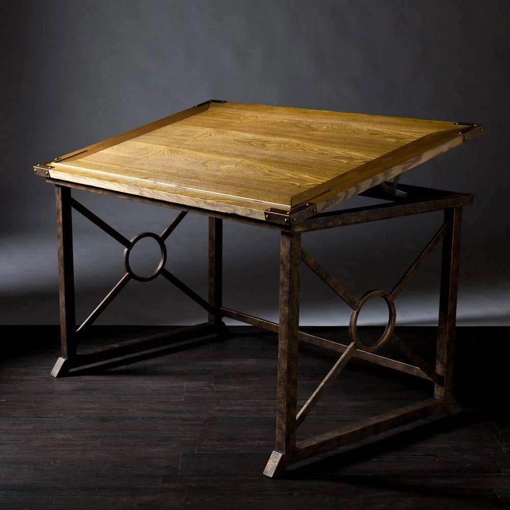With a wide frame and ample work area, this industrial style drafting table is perfectly proportioned for larger spaces. Its wood tilt-top in weathered oak reclaims a rustic look against the durable, antique brass finish metal frame and accents. A built-in ridge spanning the extensive workspace secures papers and utensils while you work. Simply lift the back edge to modify the tabletop to an ideal incline position.