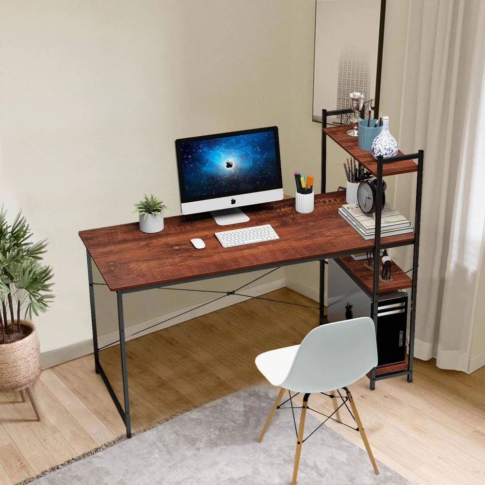 This 55 in. brown computer desk with bookshelf is not only beautiful, but also practical and convenient. The spacious particleboard table top and the additional three-layer bookshelf are convenient for you to place more personal items. The stable metal table legs provide good stability. The table top can carry up to 450 lbs., which is convenient for you to use for a long time. Whether used for work or for study, it can bring you a good experience.