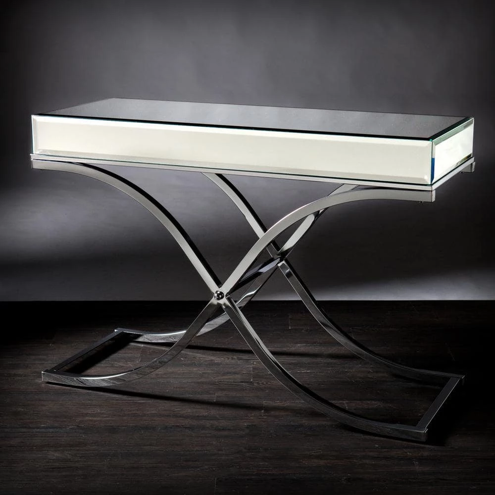 Illuminate your entryway or living room with this enchanting mirrored console table. An elegantly bowed metal x-frame forms an enticing shape with the multifaceted tabletop. Beveled mirrors and a reflective chrome finish accentuate the chic look. This captivating console table adds instant glamour to contemporary styled homes.