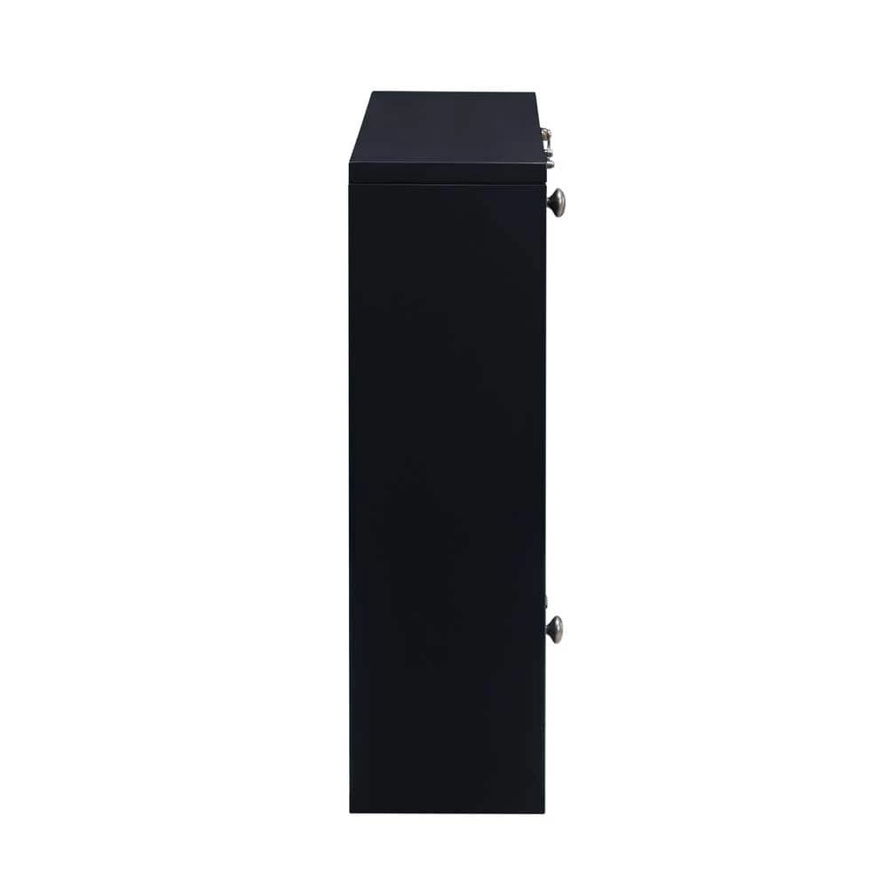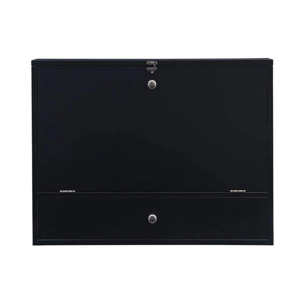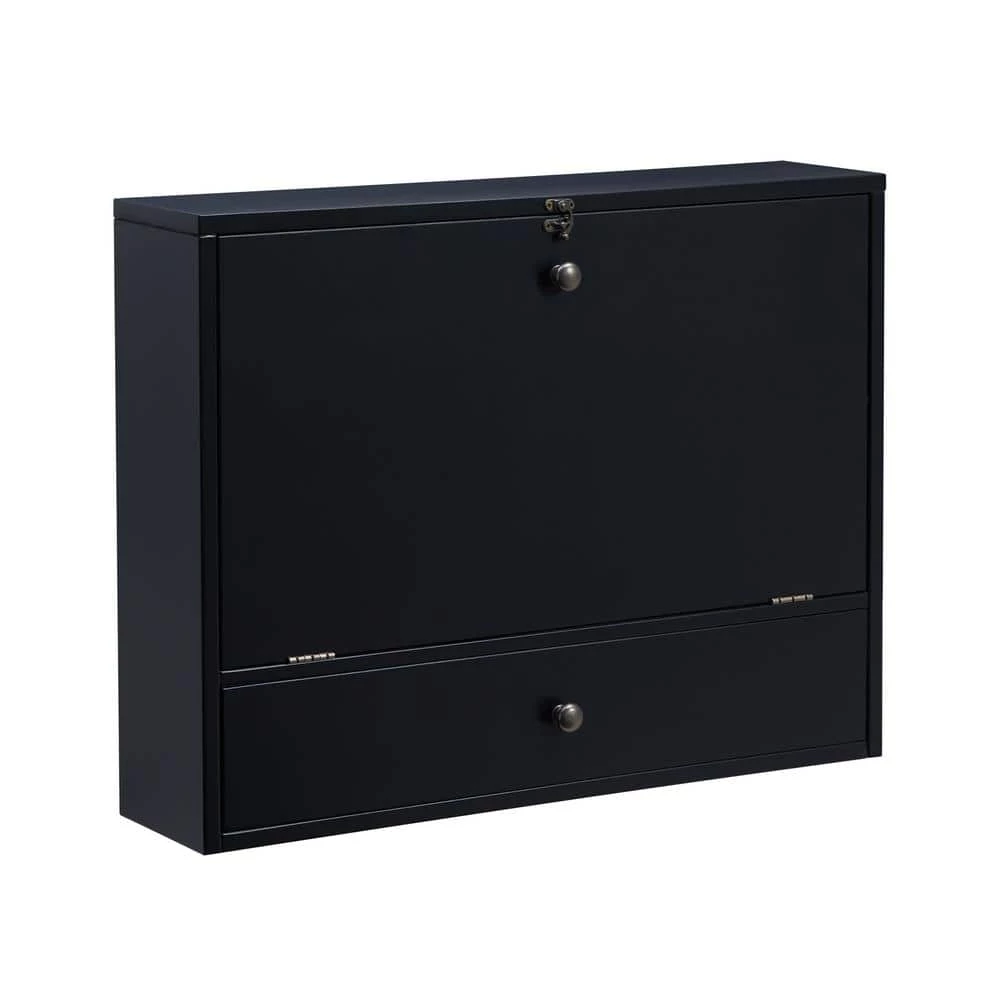 Unlatch a world of storage opportunities with this sleek black, multifunctional floating desk. Folddown writing surface also works as a stand for electronics, snacks, or an imagination station. Multiple differentlysized cubbies store office essentials, recipe cards, or stampers; angled paper organizer and corkboard keep tasks in check. Mount this goesanywhere space saver as a laptop desk in the home office or open concept living space, recipe center in the kitchen or dining room, or organizeddesign place in a craft room.