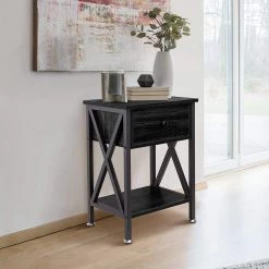 Drawer Black Nightstand with Open Storage Shelves for Bedroom Living Room by Huluwat