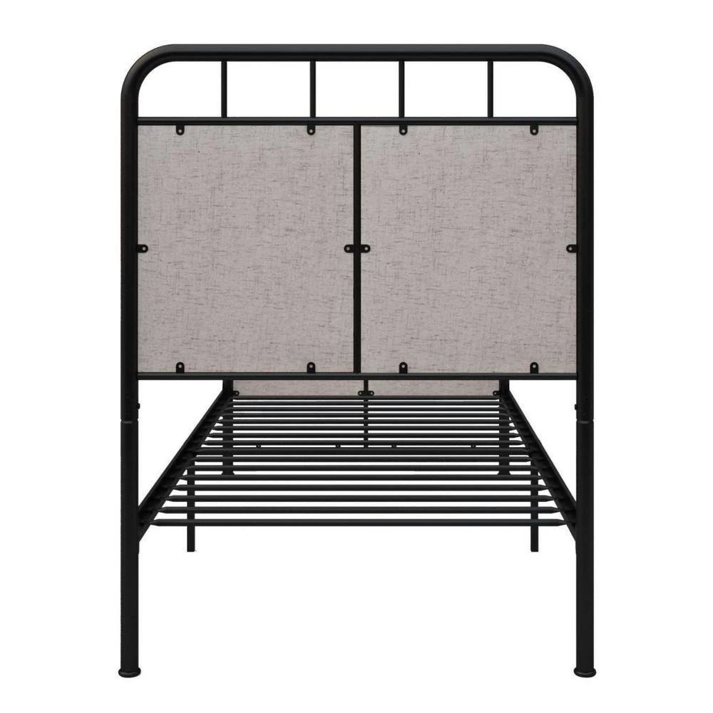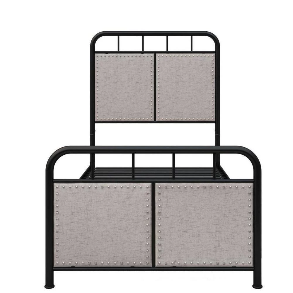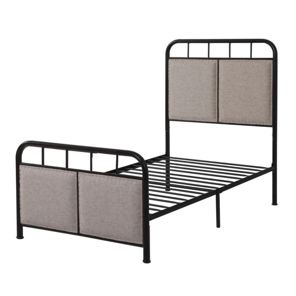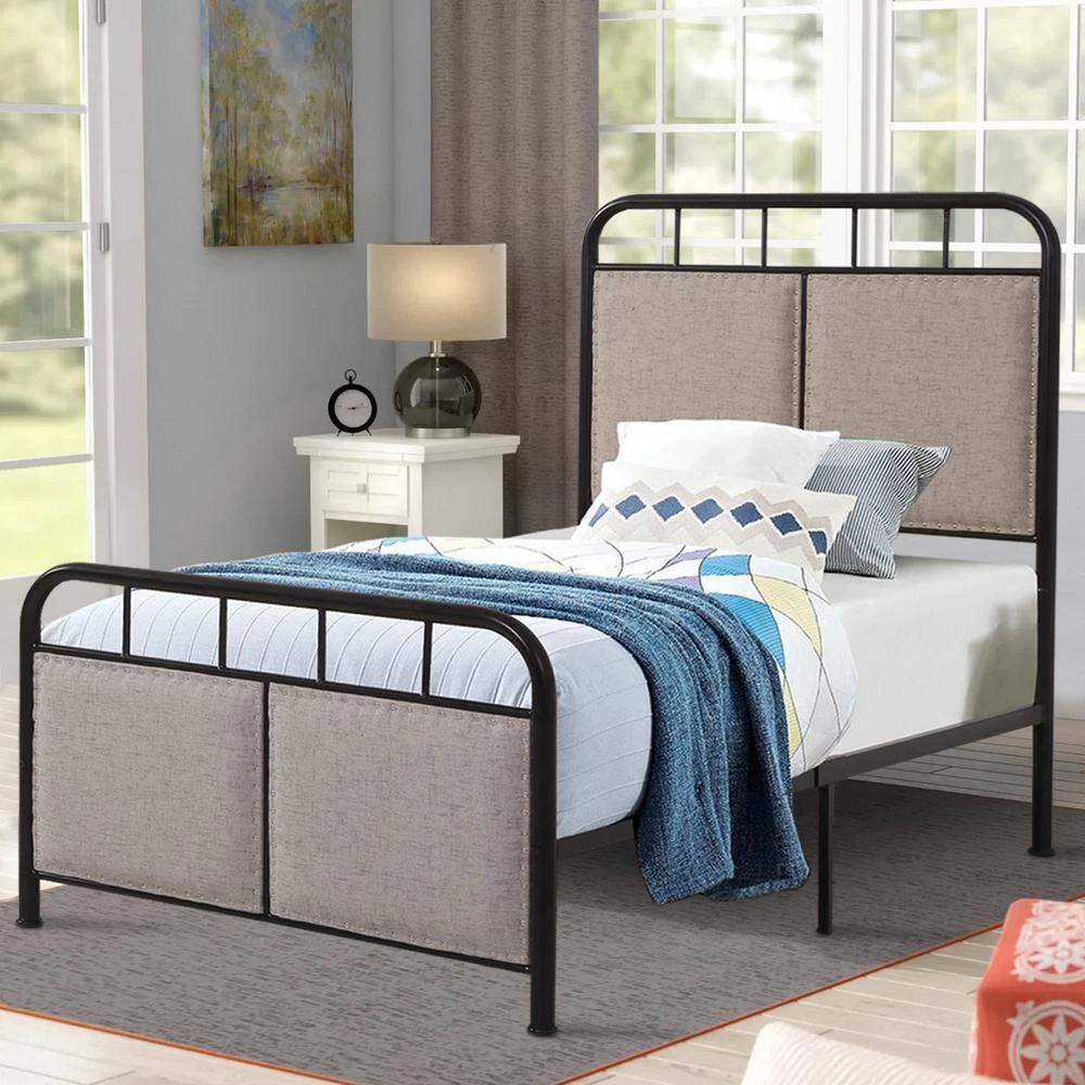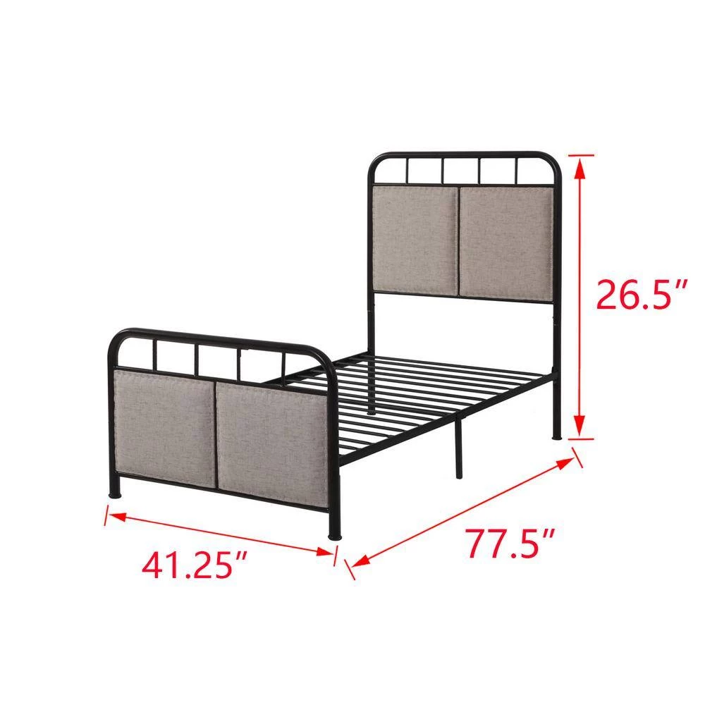 This twin-sized metal bed frame with a fabric headboard and footrest is modern in shape and simple in design. It is mainly made of high-quality metal, strong in structure and durable. At the same time, it has a good load-bearing capacity, the maximum load-bearing capacity is up to 250 pounds, suitable for your long-term use. In addition, it is easy to install and can be suitable for any mattress type and modern style of any bedroom.