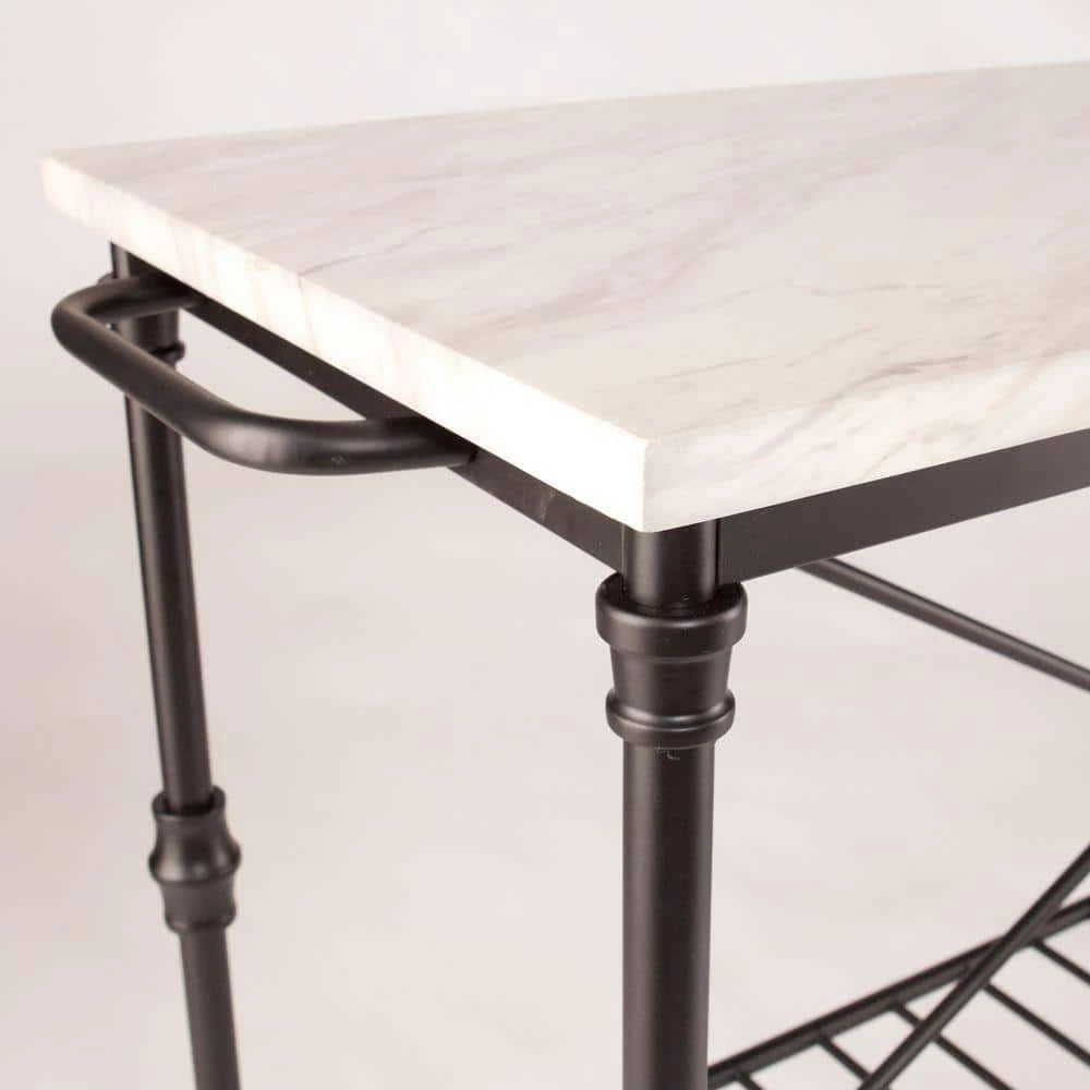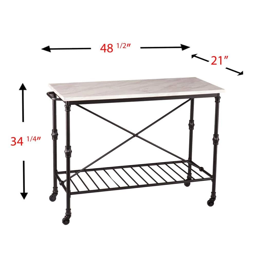Simmer a reduction in kitchen clutter with this country chic, easy rolling galley island. Authentically textured, warm gray marble-look countertop sleekly shines atop matte black, scrollwork inspired cart. Sweeping slatted shelf hosts everything from pots and pans to cookie sheets while the open X-frame creates a center divide for additional organization. Your small space kitchen can have its cake and eat it too, just employ this refined industrial island permanently as a go-to coffee bar or slide around your kitchen for a mobile prep station. Variations in faux marble texture should be expected, giving each piece a unique look. Faux marble surface is not knife safe, spills should be cleaned immediately to protect finish.