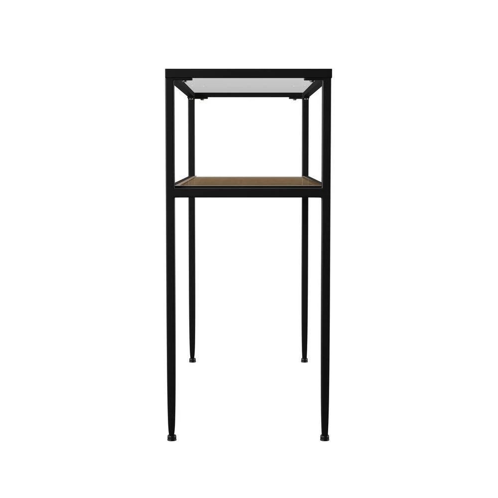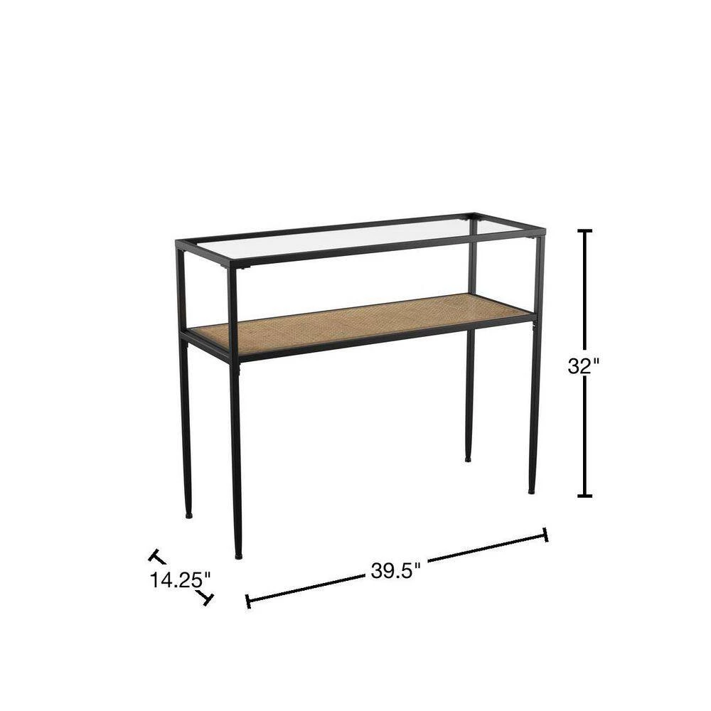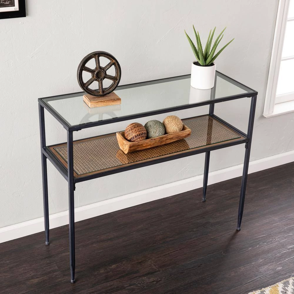Upgrade your display storage with this modern farmhouse hallway table. A spacious glass tabletop and shelf provide ample space for fresh flowers and family photos, while the natural rattan accent brings a coastal feel to your living room or den. The two-tiered design creates a shadowbox look, stylishly showcasing your keepsakes and modern decor. Bring home style and functionality when you place this storage console table in your living space or entryway.