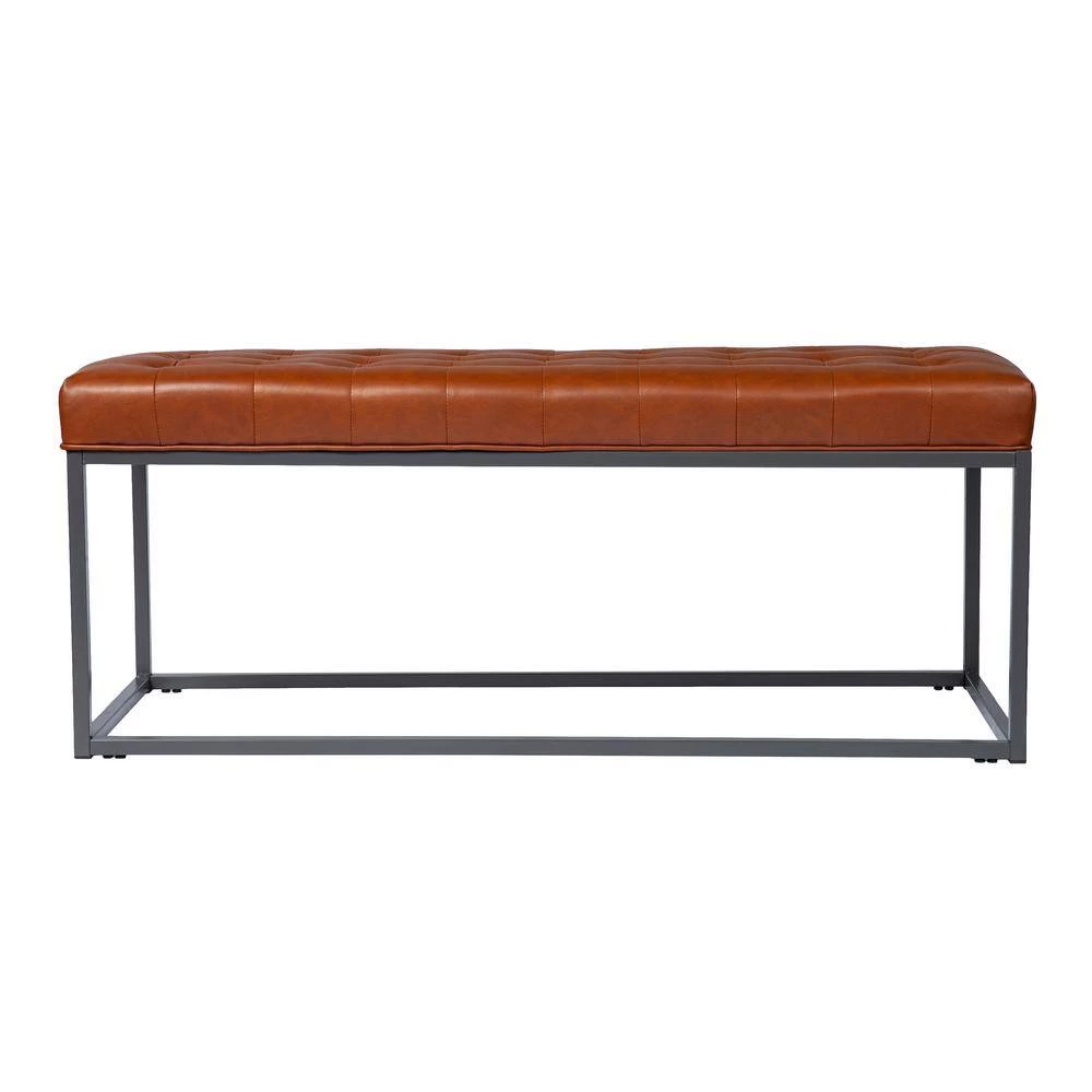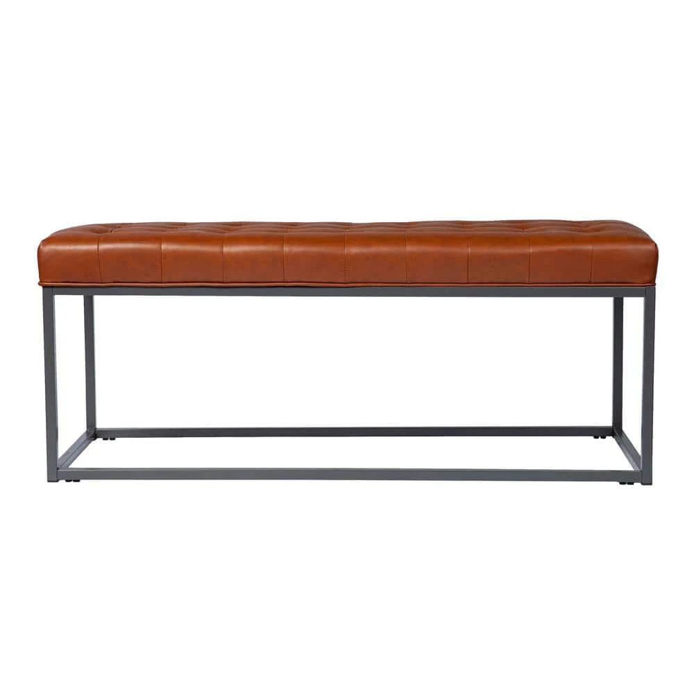 Slide into sleek style with this contemporary hallway bench. Rich brown upholstery canvases the comfortable seat, while button tufted accents add a layer of classic design. Gray metal legs box in modern style, complementing your updated look. Add stylish seating to your foyer or living area with this 2-tone upholstered bench.