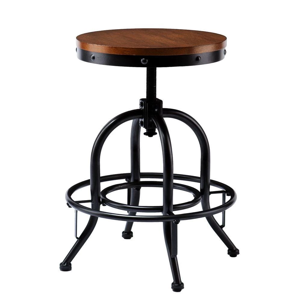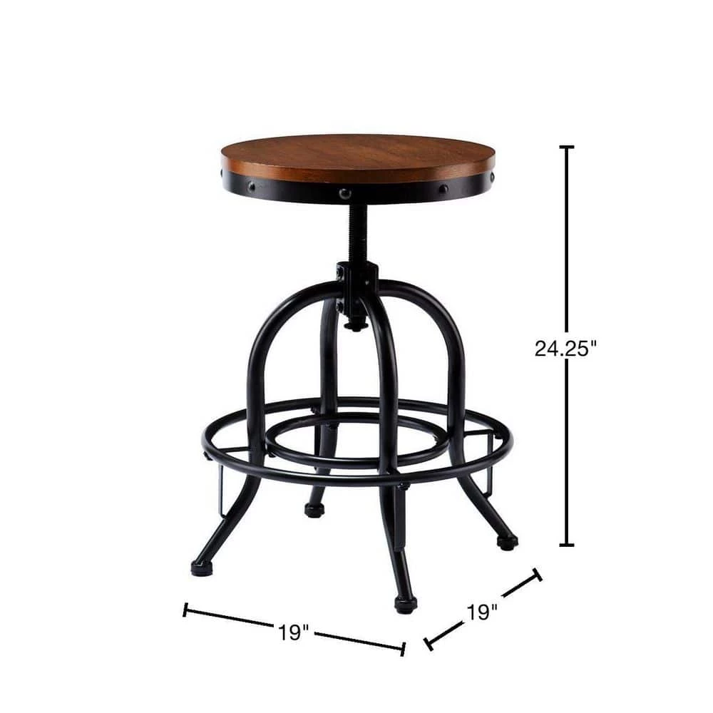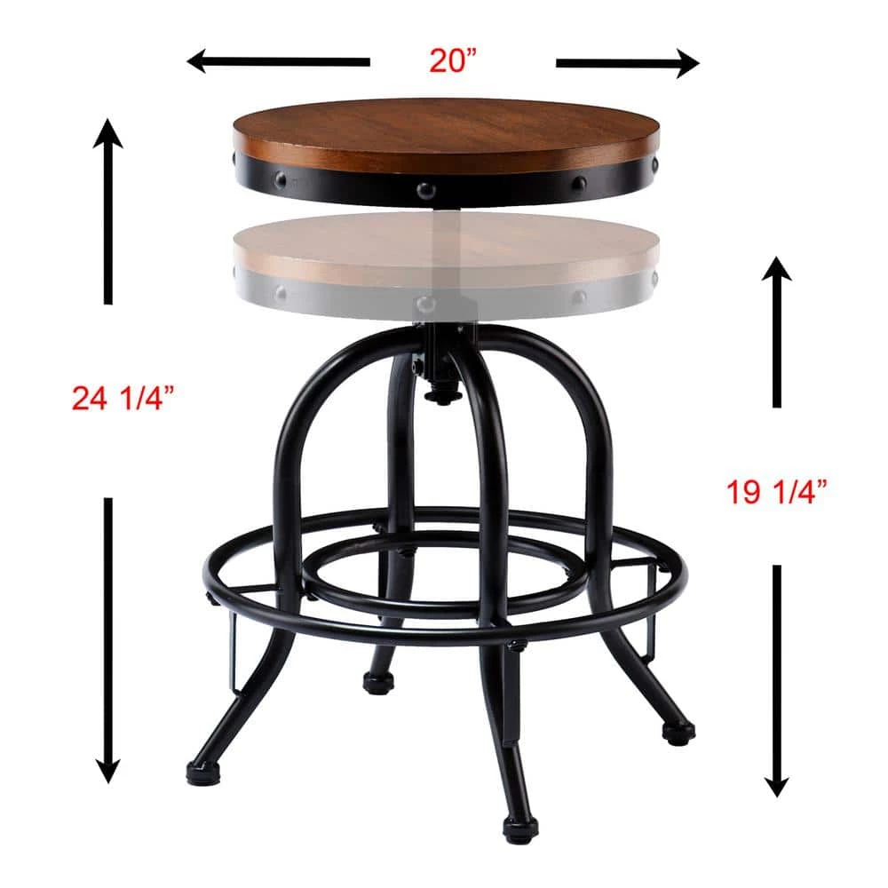 Renovate a room with the reclaimed look of this industrial style stool. A distressed dark pine seat sits atop the curved, black metal frame in a machinery-like design. Adjustable, round stool swiftly goes from desk height to counter height for vintage inspired seating in the kitchen or home office. Mix in this stool for an unexpected yet modern twist to many styles, from rustic to midcentury, contemporary to farmhouse.