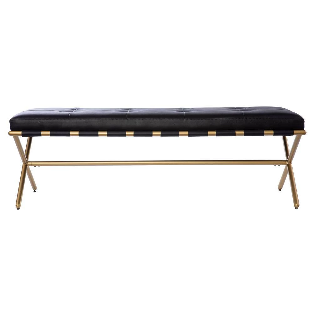 Elevate your entryway with this modern faux leather bench. Tufted upholstery creates a classic, tailored look, while the gold metal frame adds a touch of glam. Faux leather straps craft a unique design, providing support in sleek style. Place this 2-tone bench at the foot of your bed for a functional accent piece, or slide up to your dining table to entertain party guests. Add stylish seating where you need it most with this contemporary bench seat.