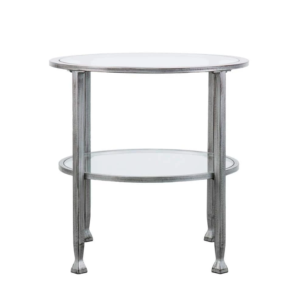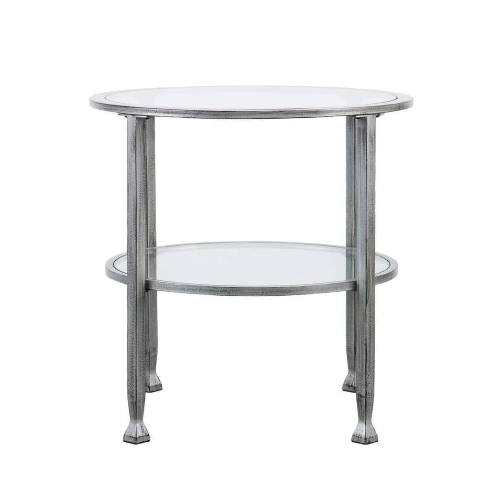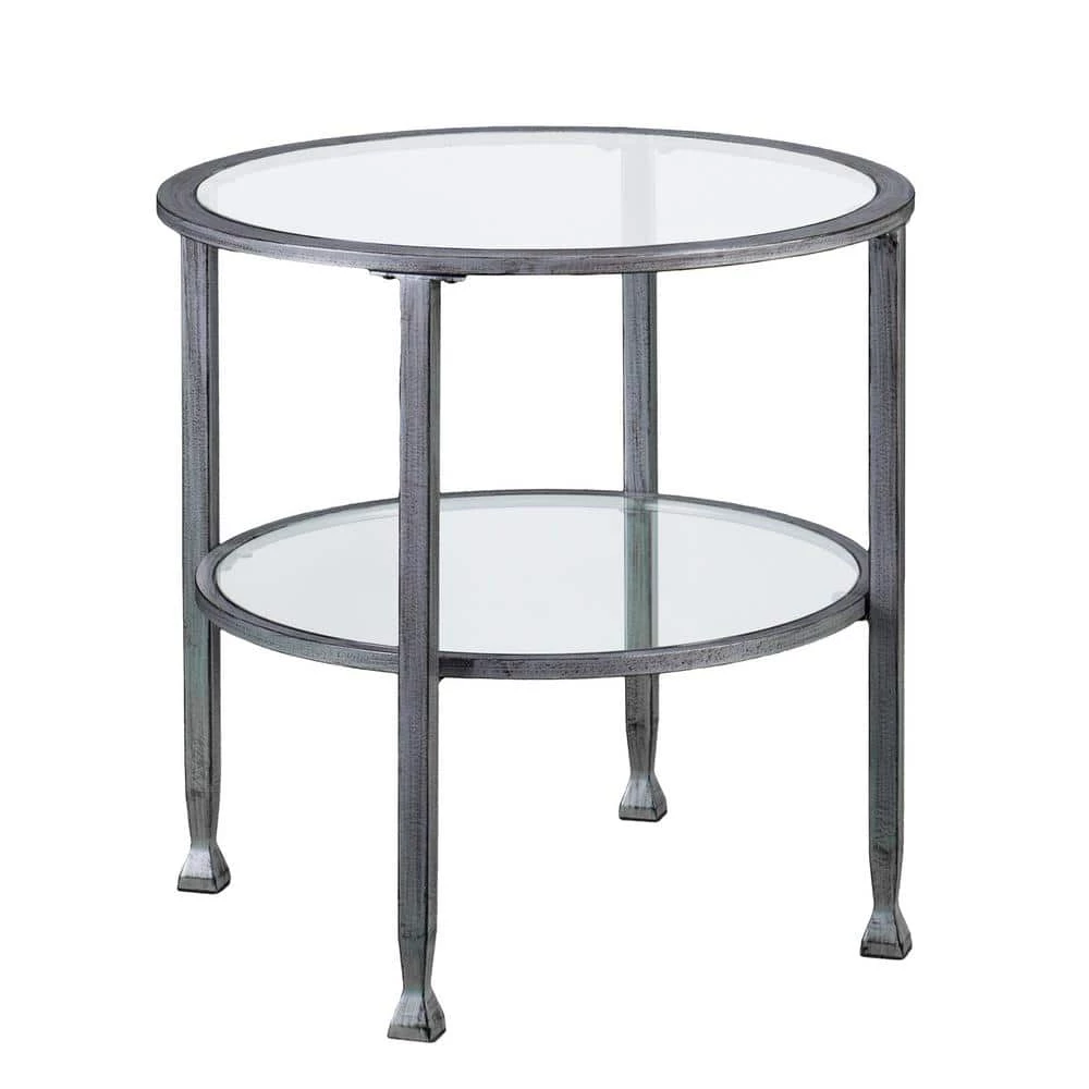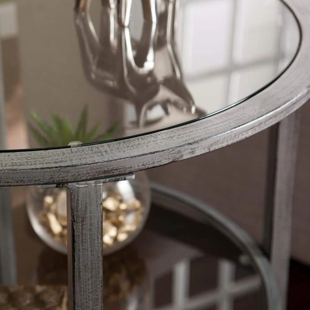 Circle gets the square with this understatedly sophisticated end table. Sleek distressed silver metal cradles tempered glass tabletop and shelf into open architecture, ready to display your top ten reading list or favorite mementos. Take a fresh turn on contemporary style with this simply chic accent table betwixt 2-chairs in a reading nook, as a nightstand in the bedroom, or next to the sofa as a side table in the living space. Hand-painted, distressed finish will vary.