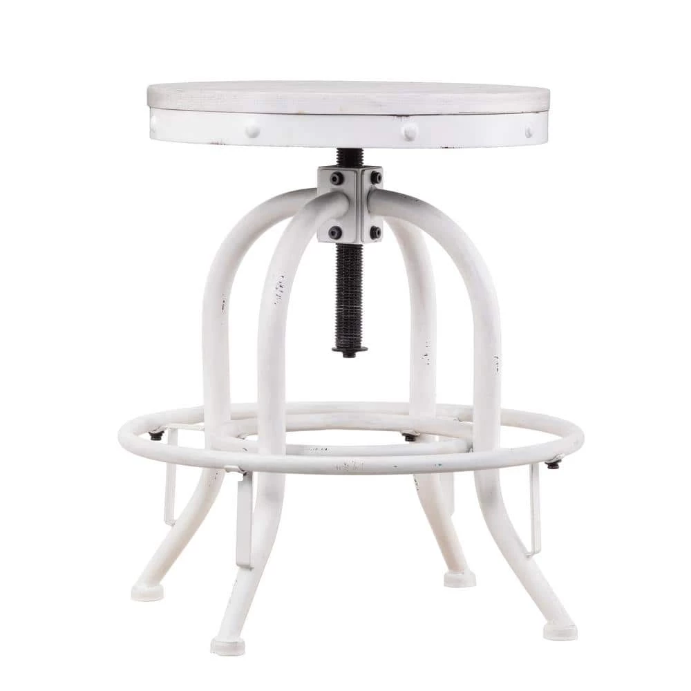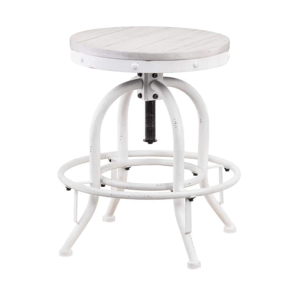 Where farmhouse and industrial style meld, you’ll find this adjustable height stool. Whitewashed, shiplap-esque planked seat and antiqued white metal combine for a rustic take on a classic silhouette. Convenient convertibility takes this stool from casual anywhere seating to counter height in a snap. Nail a rugged, countrified look with this adaptable stool pulled up to a kitchen island, game table or vanity. Distressing, whitewashing and wood grain will vary.