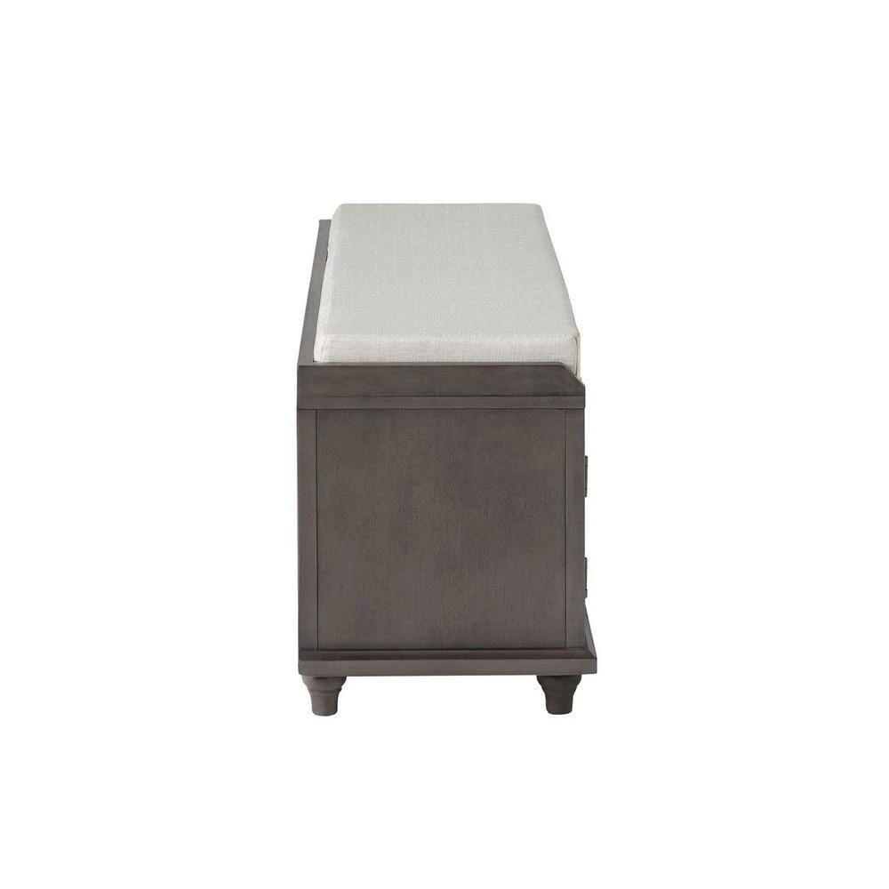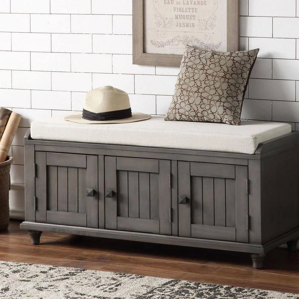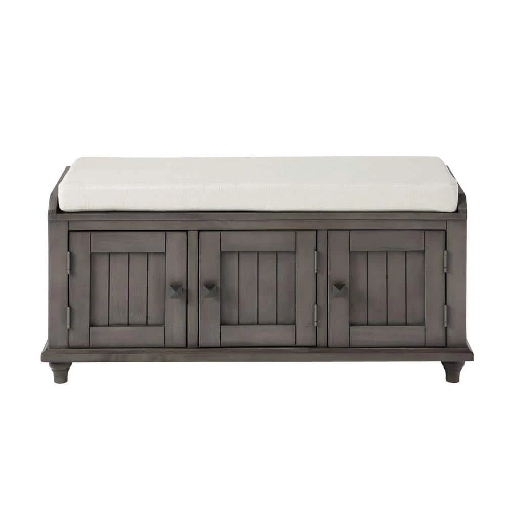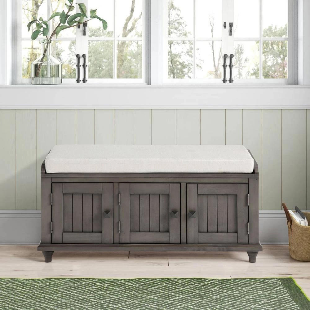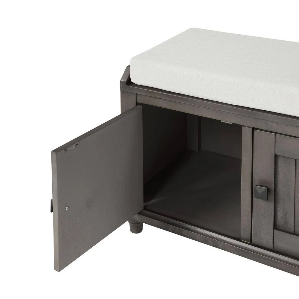 This grey multifunctional storage bench is exquisite in shape and stylish in design. It is mainly composed of high-quality solid wood frame and soft cushion, which is solid and durable. It is designed with 2 cabinets for you to store some daily necessities, etc. It is very suitable for stacking boots and flat shoes underneath, and provides a convenient place for guests to sit and take off their shoes. It is also equipped with high-quality polyester fiber upholstered seats, soft and comfortable, making you more comfortable when sitting down. In addition, it is easy to clean, and you can wipe it off quickly with a dry cloth.