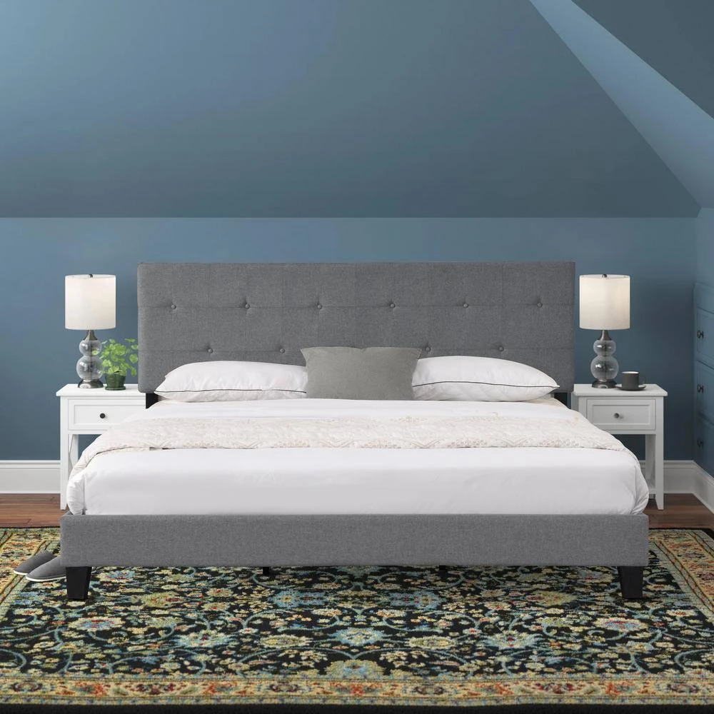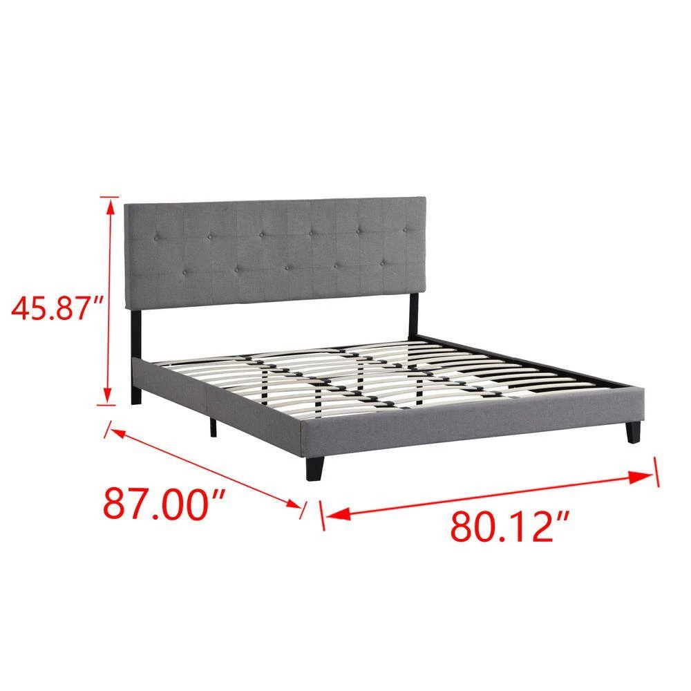 This grey king-size upholstered platform bed frame features a button-tufted linen headboard and a sturdy wooden frame. It is modern in shape and simple in design. It is mainly made of high-quality wood and linen fabric, with strong structure and durability. At the same time, it has good load-bearing capacity, the maximum load-bearing capacity can reach 600 pounds, suitable for your long-term use. In addition, it is easy to install, suitable for any mattress type and modern style of any bedroom.