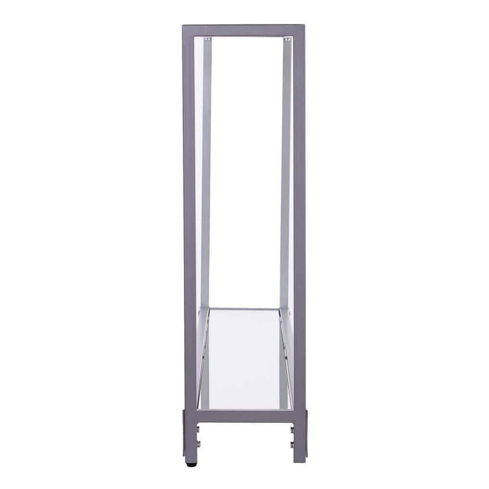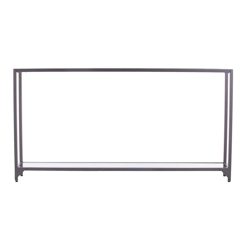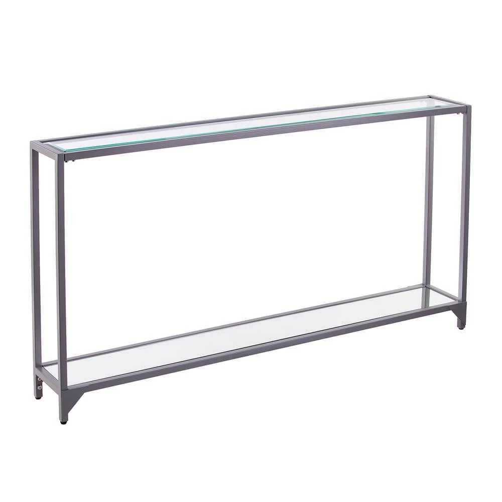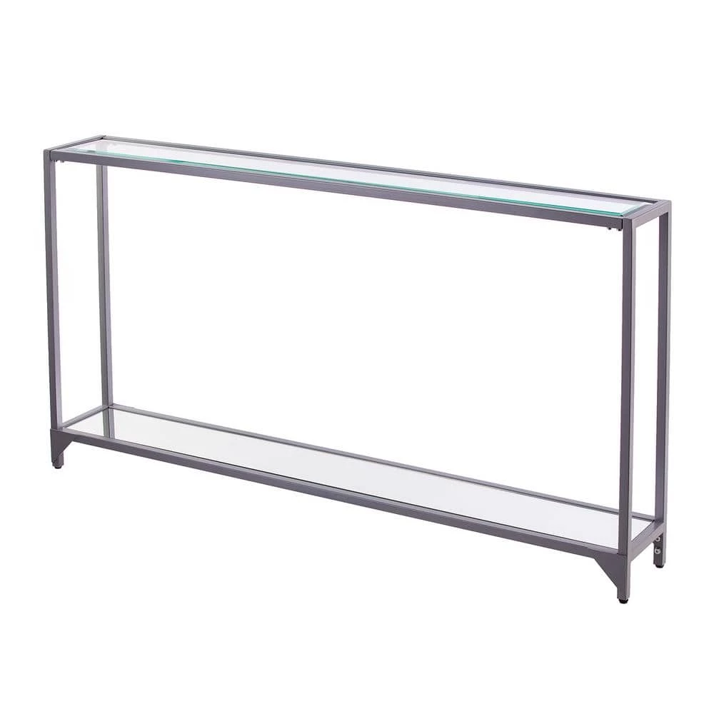 Blend glam style to any space with a touch of black nickel and glass in this anywhere console. Simple, sleek silhouette with clear glass top shelf and black glass bottom shelf creates two tiers of storage, enhancing formal and casual spaces. Narrow metal and glass media console adds drama under your wall mounted TV. Create a memory vignette with photos and accent items on your sofa table or shine a spotlight to a focal wall. This slim anywhere console, brings show-stopping style and storage to your home.