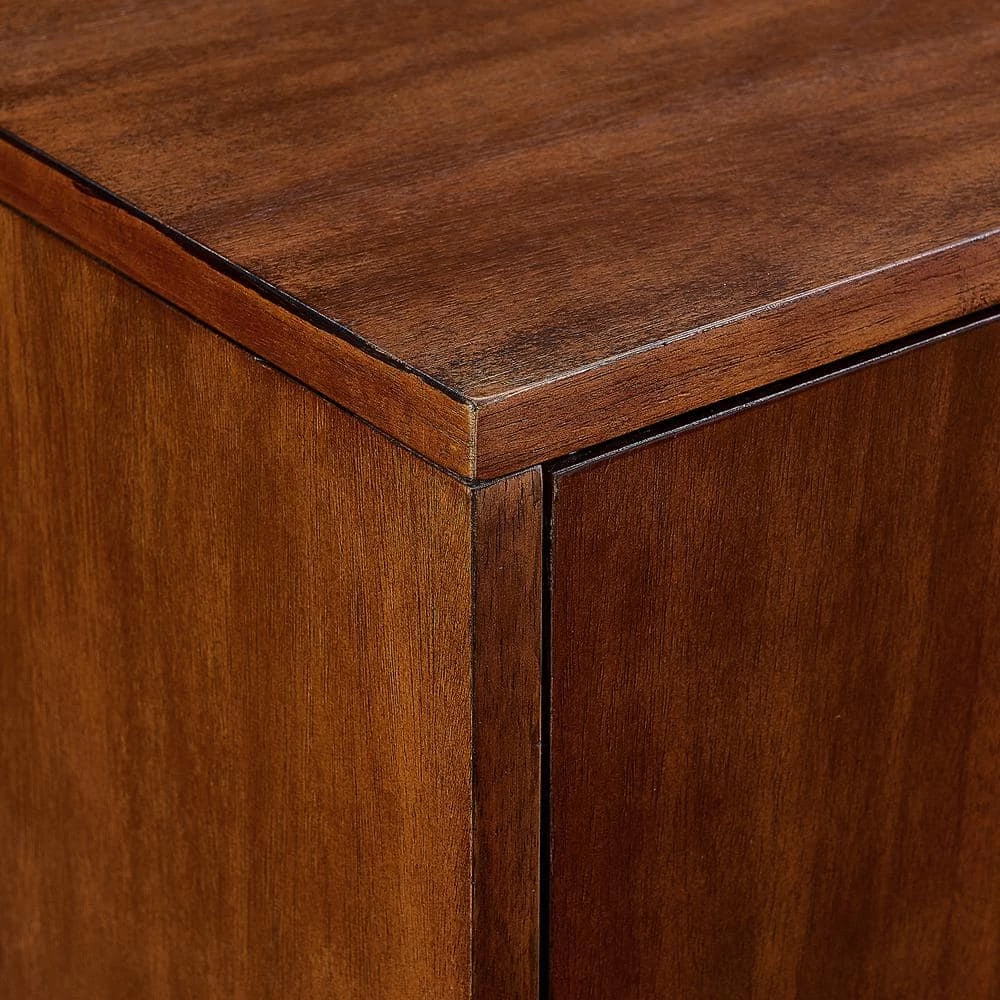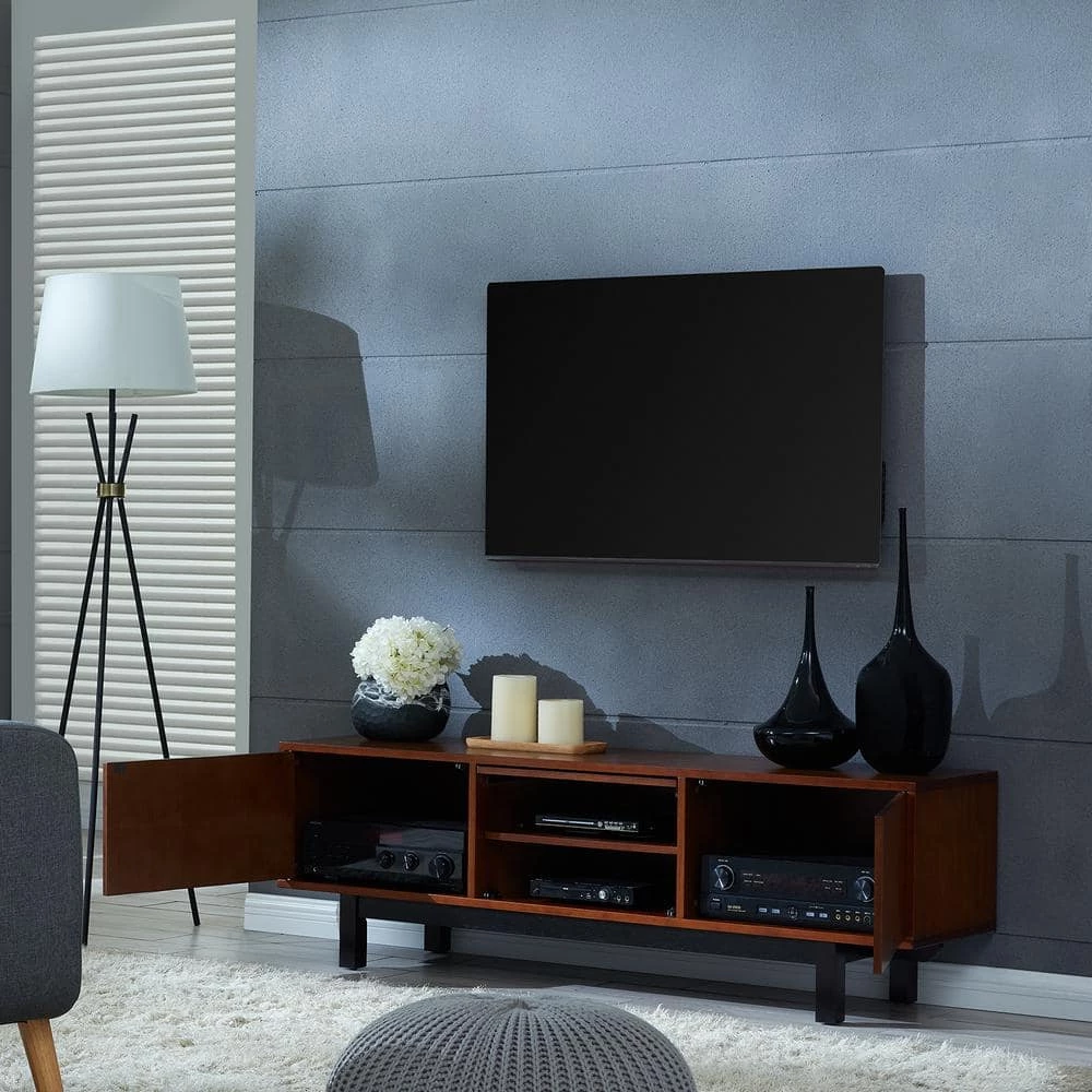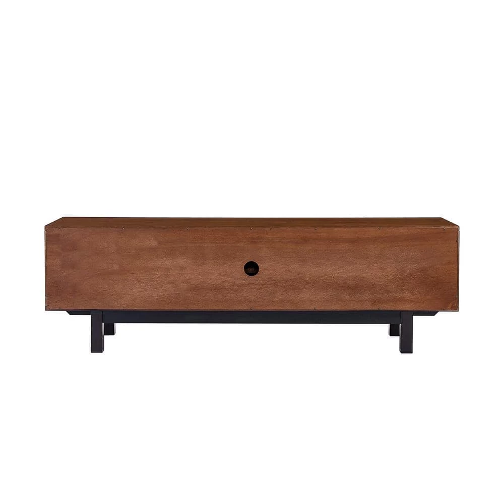 Better in threes. Ample storage comes your way in this wide scale media stand. Three cabinets tidy media accessories, placemats and flatware, or even dog walking gear. Clean, smooth profile supplies uninterrupted style, while the 2-tone composition highlights midcentury influences. Any way you slice it, this anywhere credenza serves up multipurpose form and function, from the living room to the entryway.