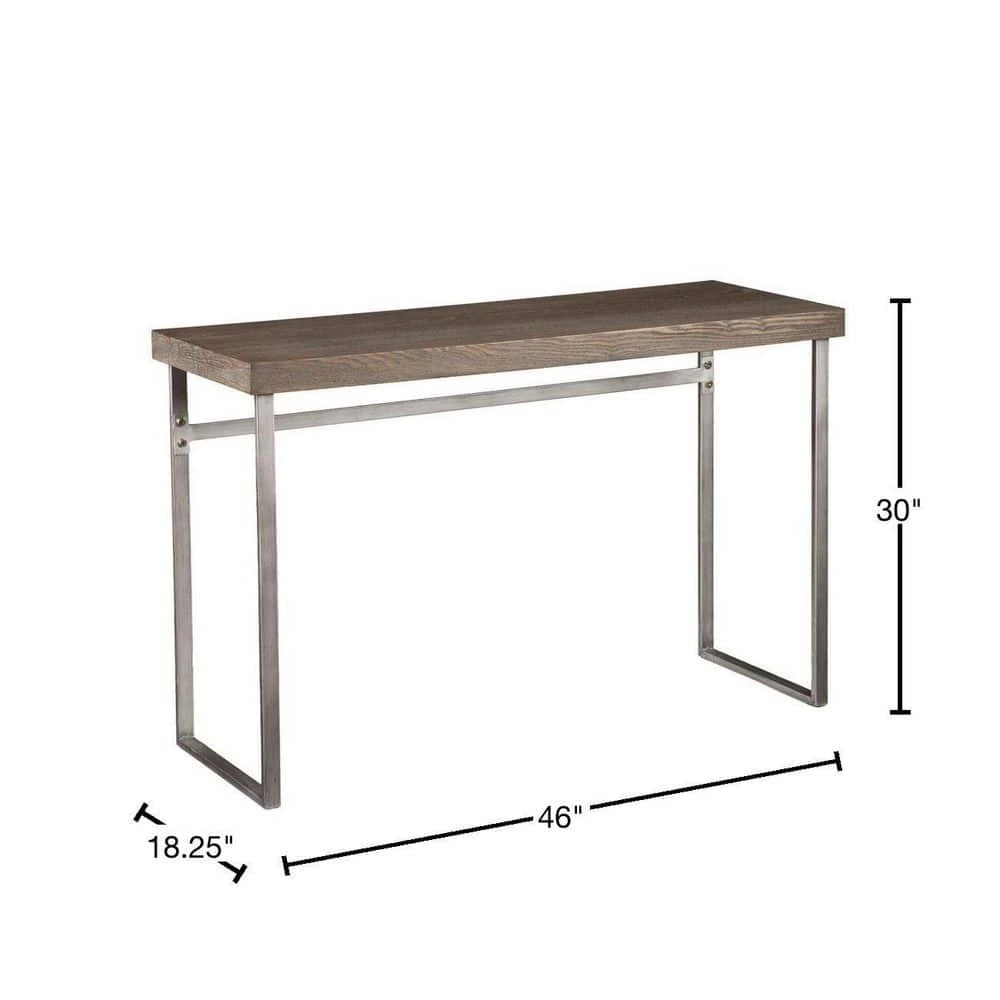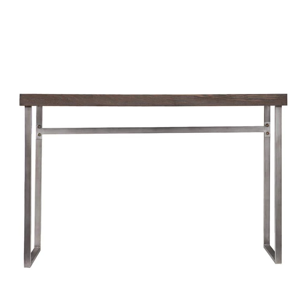 This tall console table is the perfect accent to finish out a living room with style. Place it behind a couch with a lamp or against a flat wall with a plant to bring energy into your space. Featuring a striking burnt oak finish top with a weathered gray look, this table has the personality to blend with many styles of decor. Supported by metal, U-shaped table legs with a silver powder coated appearance, this table will become the showpiece in any living room. Perfect for displaying family portraits or simply holding miscellaneous items. This console table looks fabulous in homes with contemporary to transitional styles.