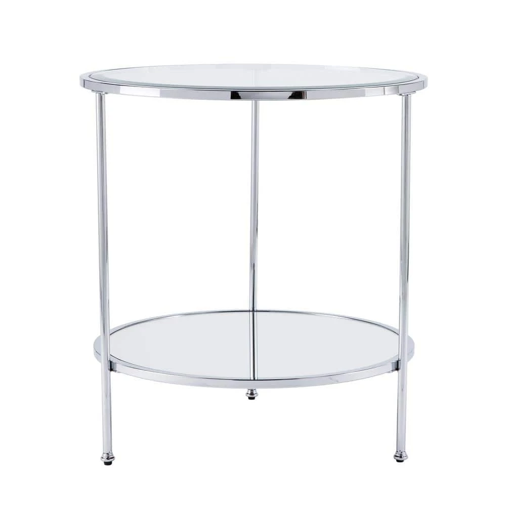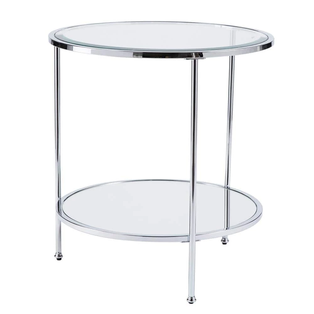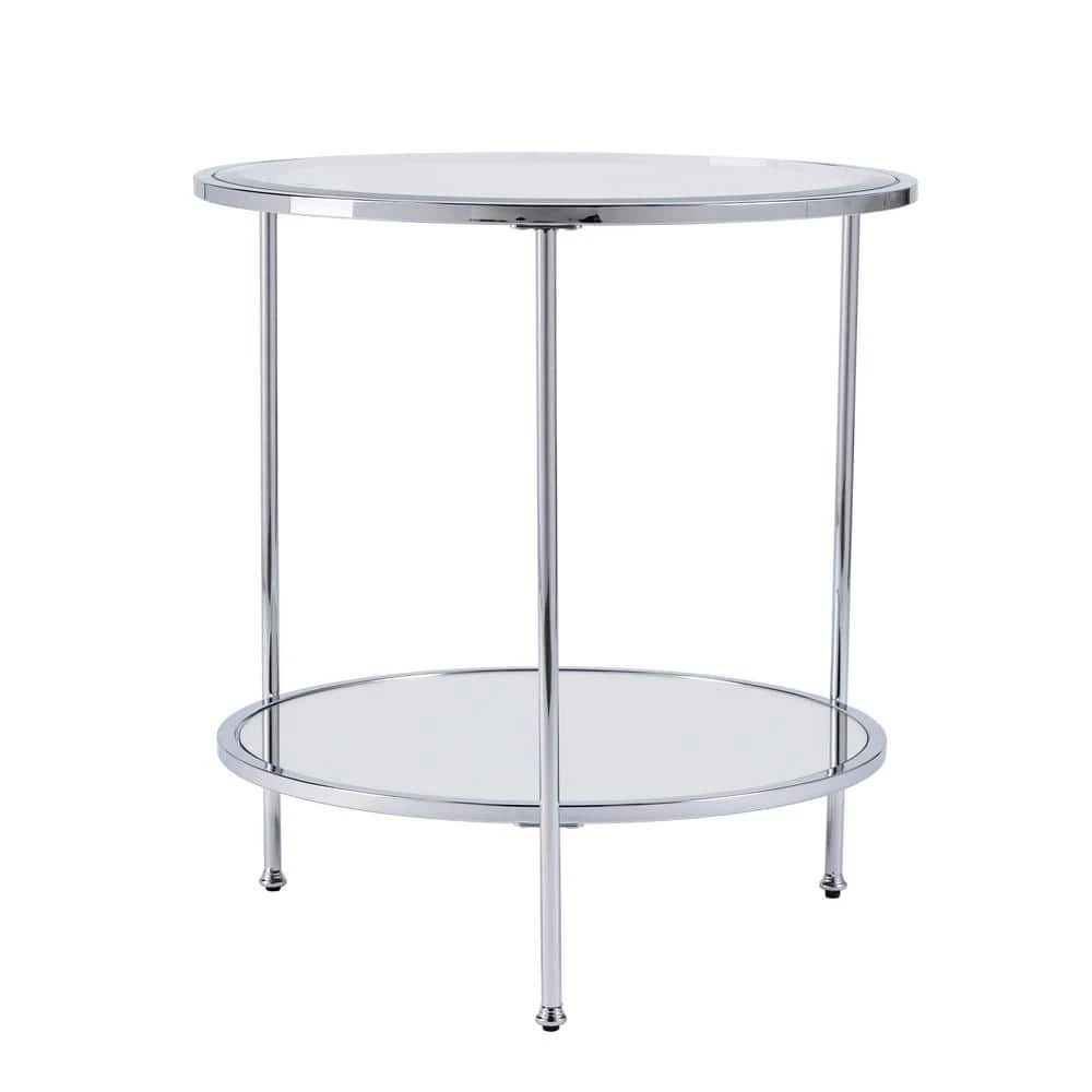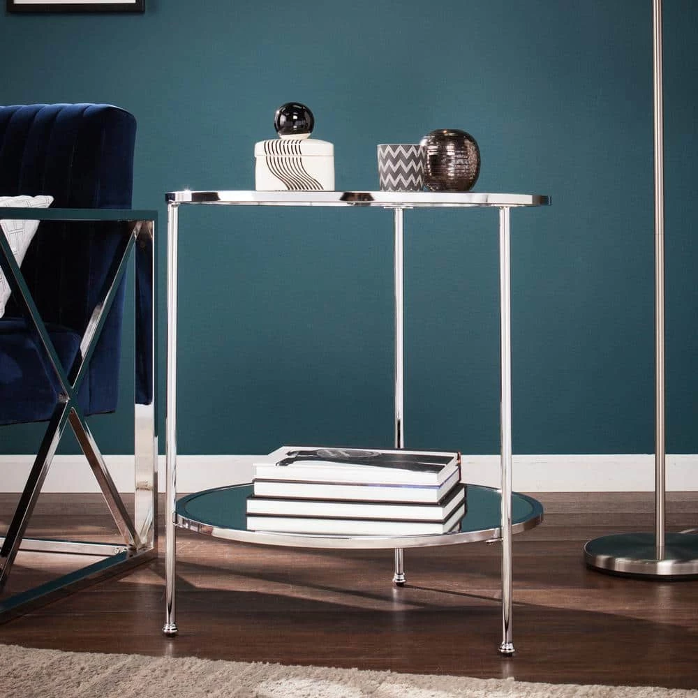 Master the 1920s scene, from the Boardwalk to the jazz stage, with this elegant end table. High shine chrome and sleek widebeveled glass rest upon simple tripod frame, crafting an airy, open silhouette. Shimmering mirrored shelf reflects the fashionlife, classic round composition echoes timeless metal and glass construction. Oh so glamorous dreams come to life when you slide this tall accent table into a reading nook, living room, or bedroom.