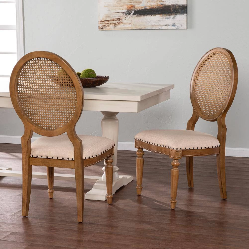 Pull up a seat with this pair of upholstered chairs. A woven backrest offers a unique design and provides support, while comfortable upholstered cushions make any meal the highlight of your day. Whether you’re sitting down to a quick and easy meal or a formal dinner, add pizzaz to your kitchen or dining space with these armless chairs.