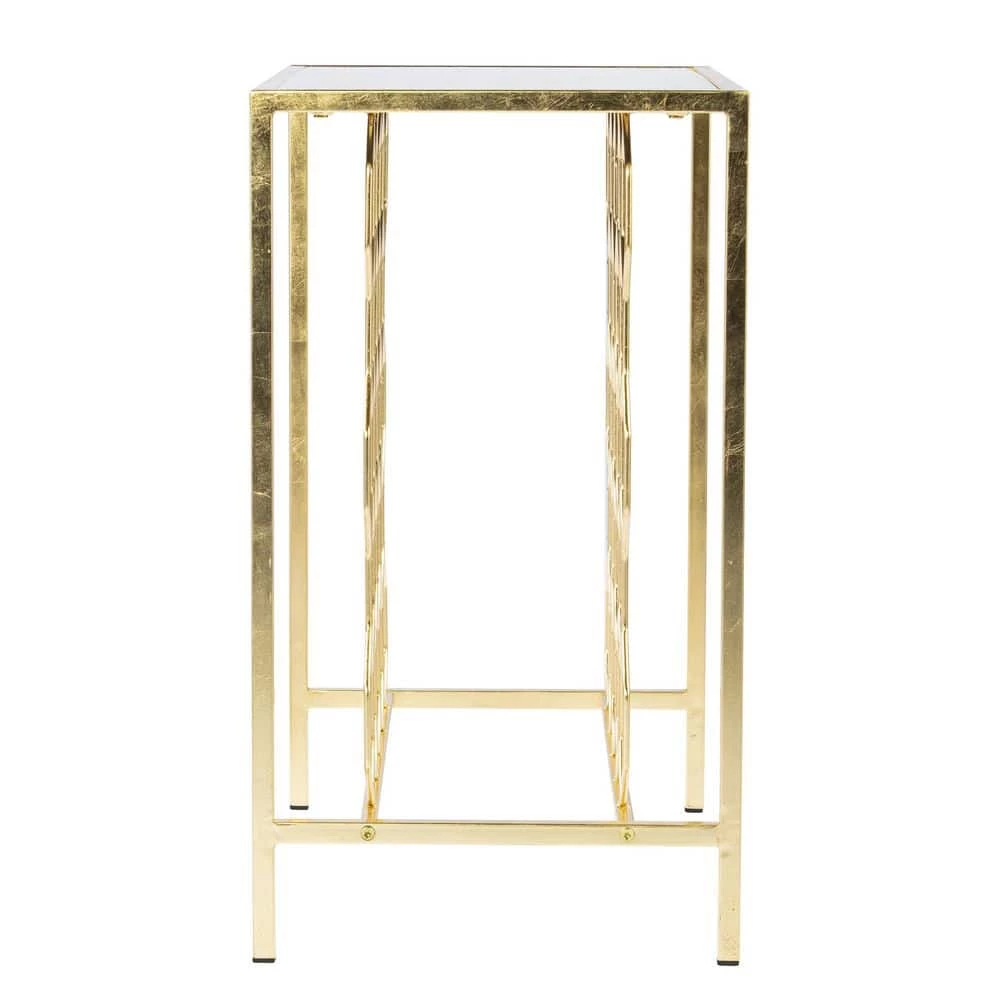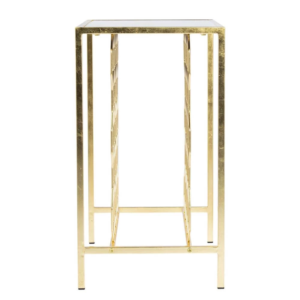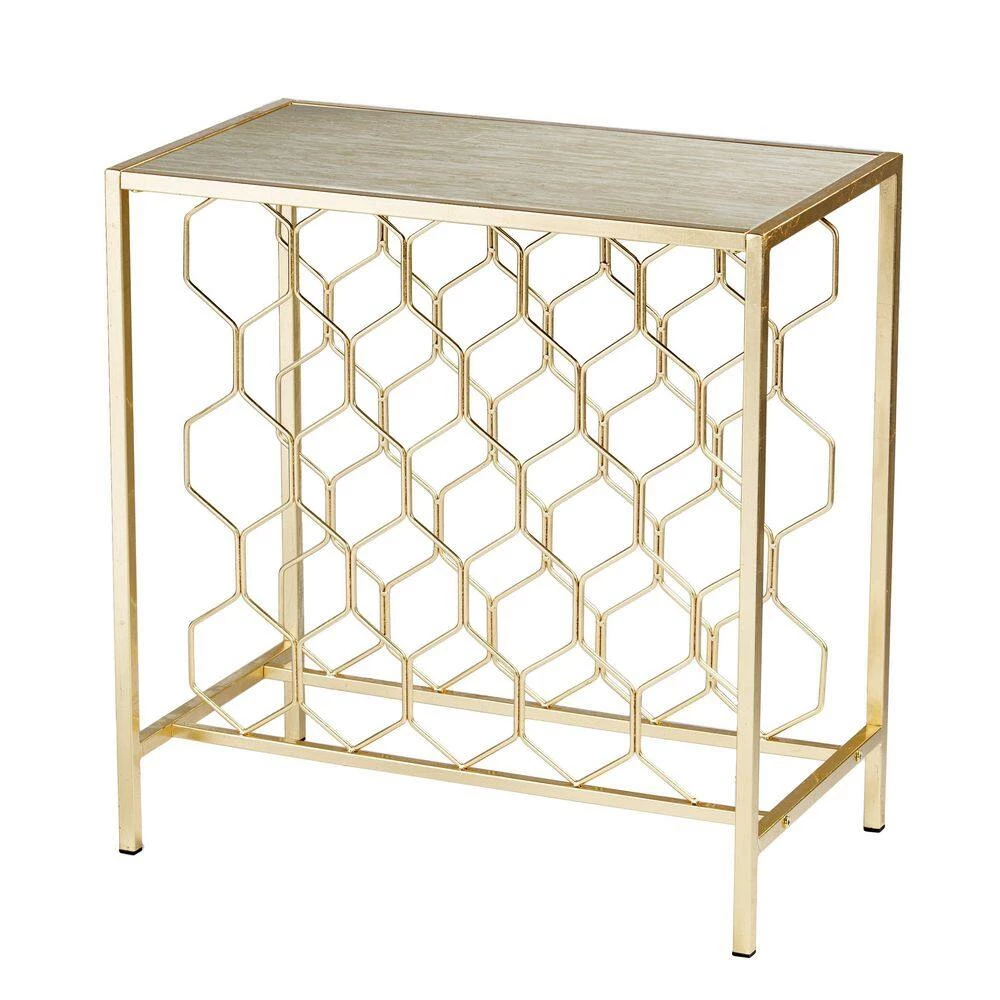Put your wine collection on display with this wine storage end table. The geometric rack showcases up to 23 bottles of your favorite reds, whites and blends, while the gold leaf finish adds a touch of glam to your decor. Slide into your dining room and serve up drinks and appetizers from the faux marble tabletop or place next to your sofa and transform your living room into a relaxing, entertaining space. Bring home a welcome addition to your home bar with this freestanding wine rack side table.