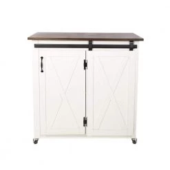 Farmhouse fresh comes to life in this mobile kitchen island. Country details and a functional barn door take a classic storage silhouette to homestead culinary chic. Two cabinets with shelves tidy up pots and pans, veggie crates, or serveware. Station as a sideboard buffet in the dining room or prep island in the kitchen for stylish storage that works.