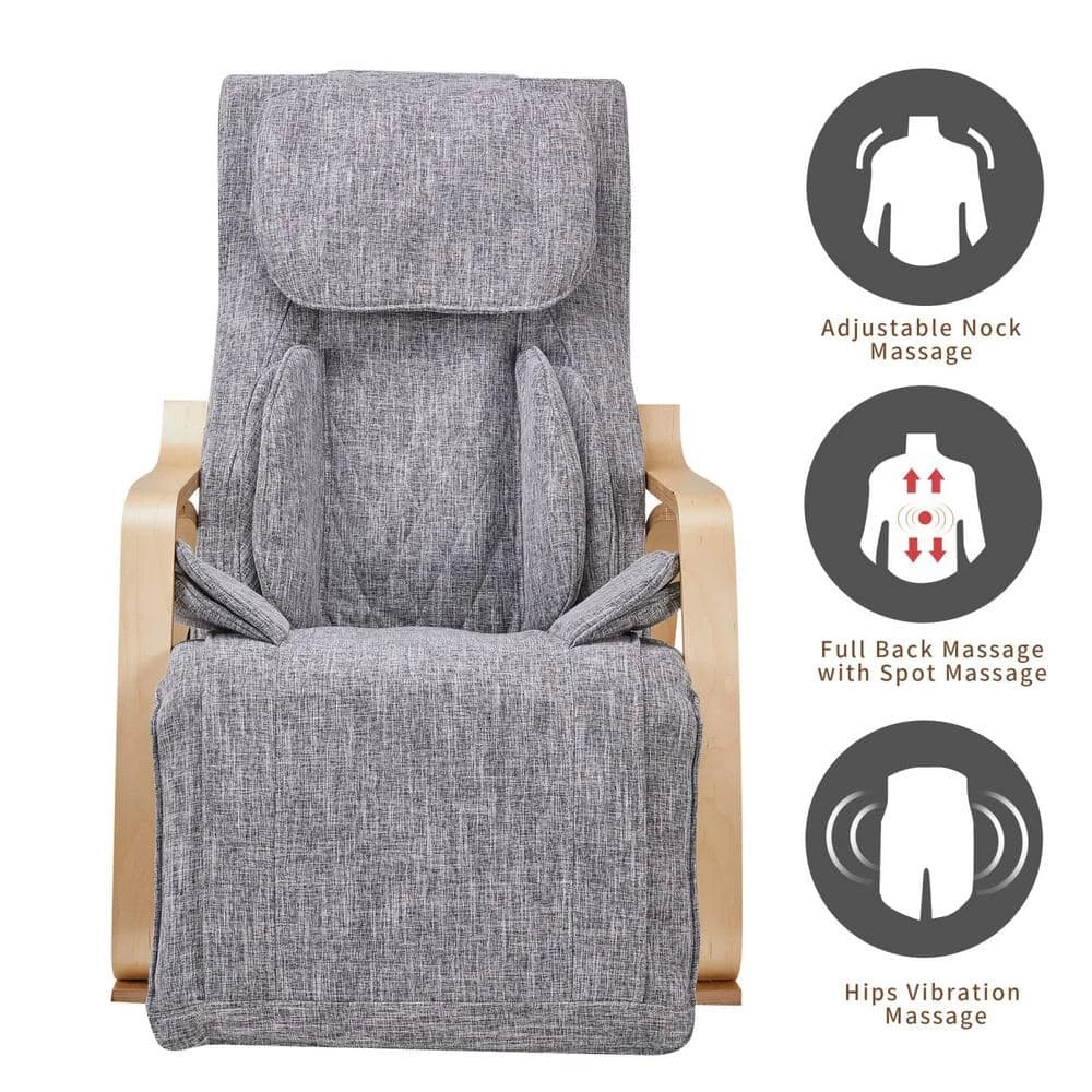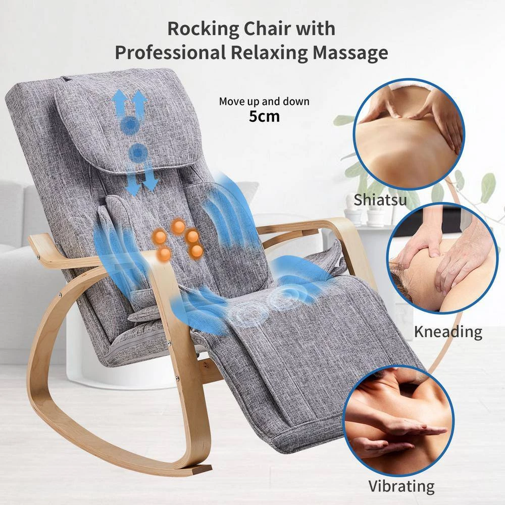 This light gray comfortable rocking chair with massage function has an exquisite appearance and stylish design. It is mainly made of linen material and wood material, with a strong structure. At the same time, it has good load-bearing capacity, the maximum load-bearing capacity is up to 330 pounds, and it is durable. It has six massage methods, which can be continued by remote control, and can be massaged in different areas of our body such as the neck, back and hip joints, allowing you to enjoy an extraordinary experience.