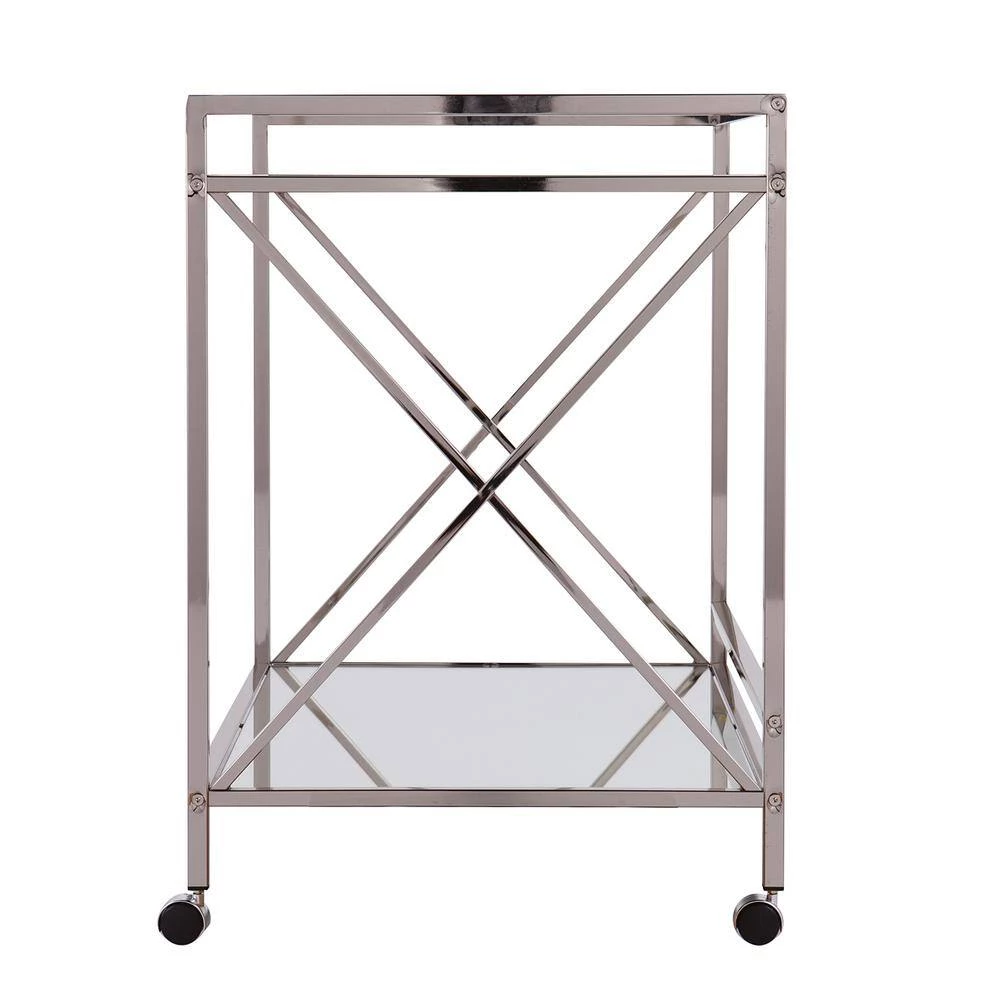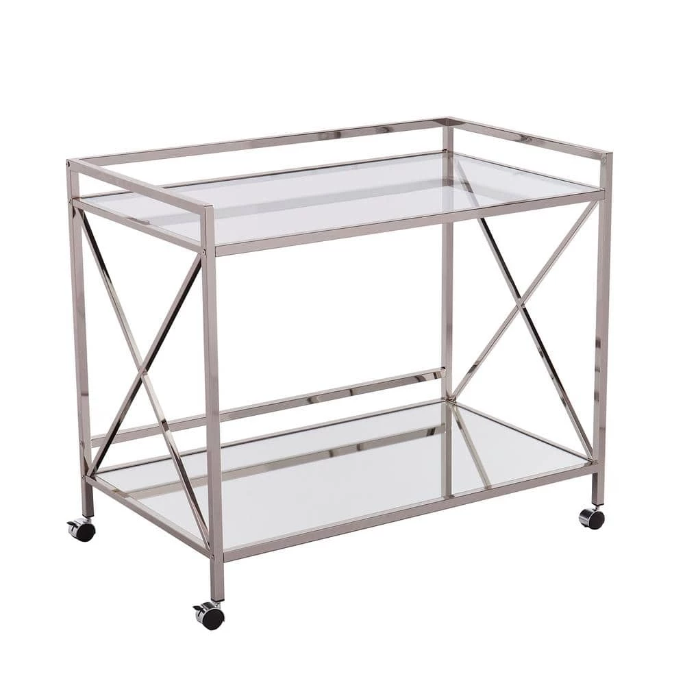 Elevate your at-home happy hour with this two-tier bar cart. Spacious shelves provide plenty of room for your martinis, stemware, and garnishes, while the metal frame adds a modern, industrial feel to your design. Deliver drinks and desserts to family and friends while entertaining in your living room or use as an elegant coffee cart for your weekend brunch in your breakfast nook. Add a chic addition to any event you host with this modern beverage cart.