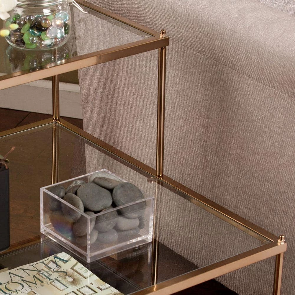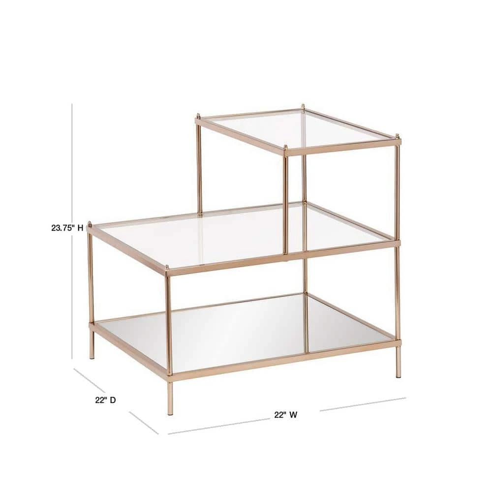 Set the Southern Enterprises Melrose End Table at the end of your sofa to beautifully complete the design of your room. This end table features a modern style, which makes it an aesthetically appealing addition to your interior design. It has storage space, which is an on-trend solution for any small items around the house. Featuring a glass top, this end table adds class to any contemporary and modern room design. With a metal frame, it will add a simple and industrial feature to your living space. This end table has a metallic gold finish, which adds some sophistication to your decor. It is built with a mirrored design, creating a stylish and bright setting.