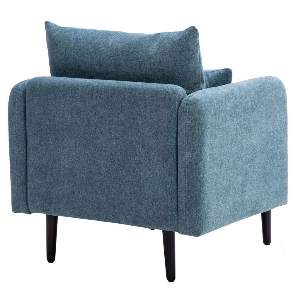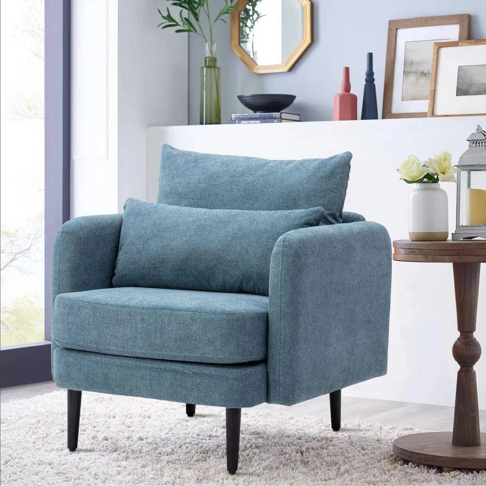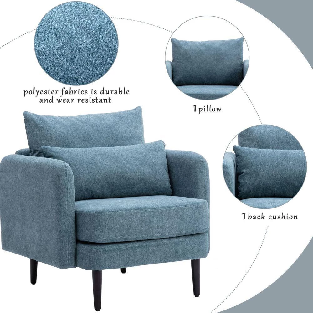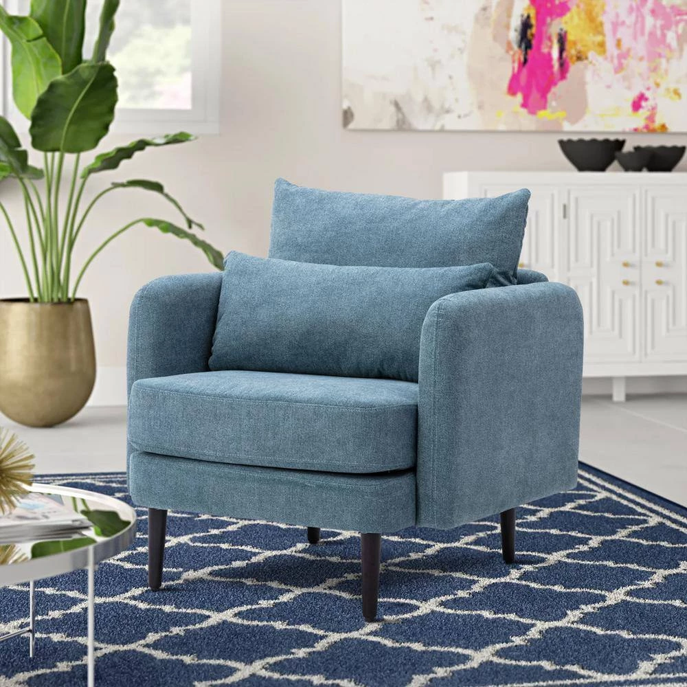 This navy blue upholstered chair with solid wood legs is beautiful in appearance and stylish in design. It can decorate your living room or bedroom more beautifully and elegantly. It has curved edges, the seat cushion is filled with thick foam and high-quality inner springs, which are very soft and comfortable. There is also a soft pillow that can be used as a cushion. This upholstered chair can provide a wonderful look to decorate your living area.