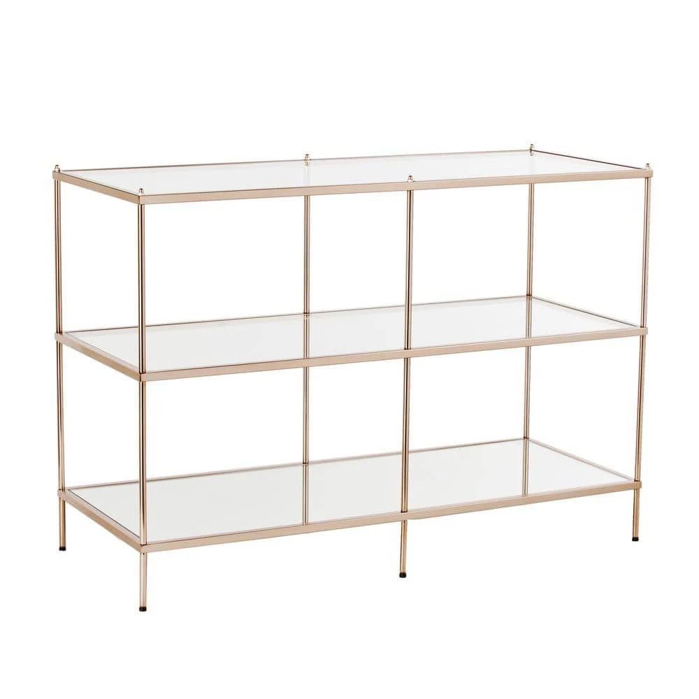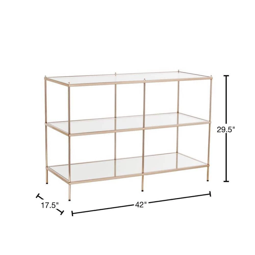 Old Hollywood glam meets modern functionality with this sleek console table. Metallic gold frame hosts shimmering mirrored and glass shelves, proudly displaying everything from board games and media equipment to kitchen utensils and cookware. Slip this multitasking console under a wall-mounted TV for a sophisticated entertaining space, into the dining room as a sparkling buffet, or in the bath for elegant linen storage.