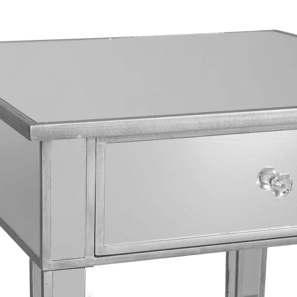 Perfect for any room, this mirrored end table is a glamorous complement for your home. With its mirrored finish, it adapts to any surroundings without overpowering yet, catches your eye with its unique presence. The practical size and function works wonders as an accent table in the living room, hall or entryway. The finishing touch of this glam side table is a spacious drawer with faux crystal knob.