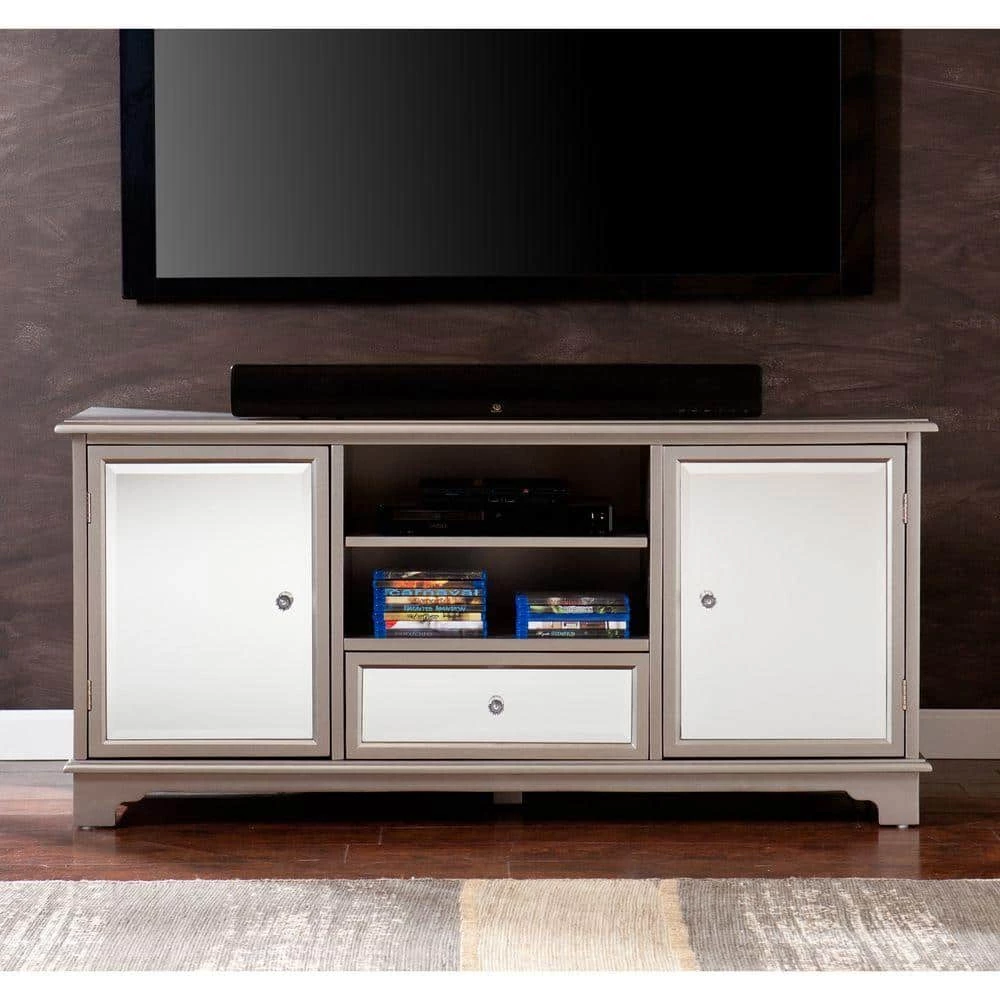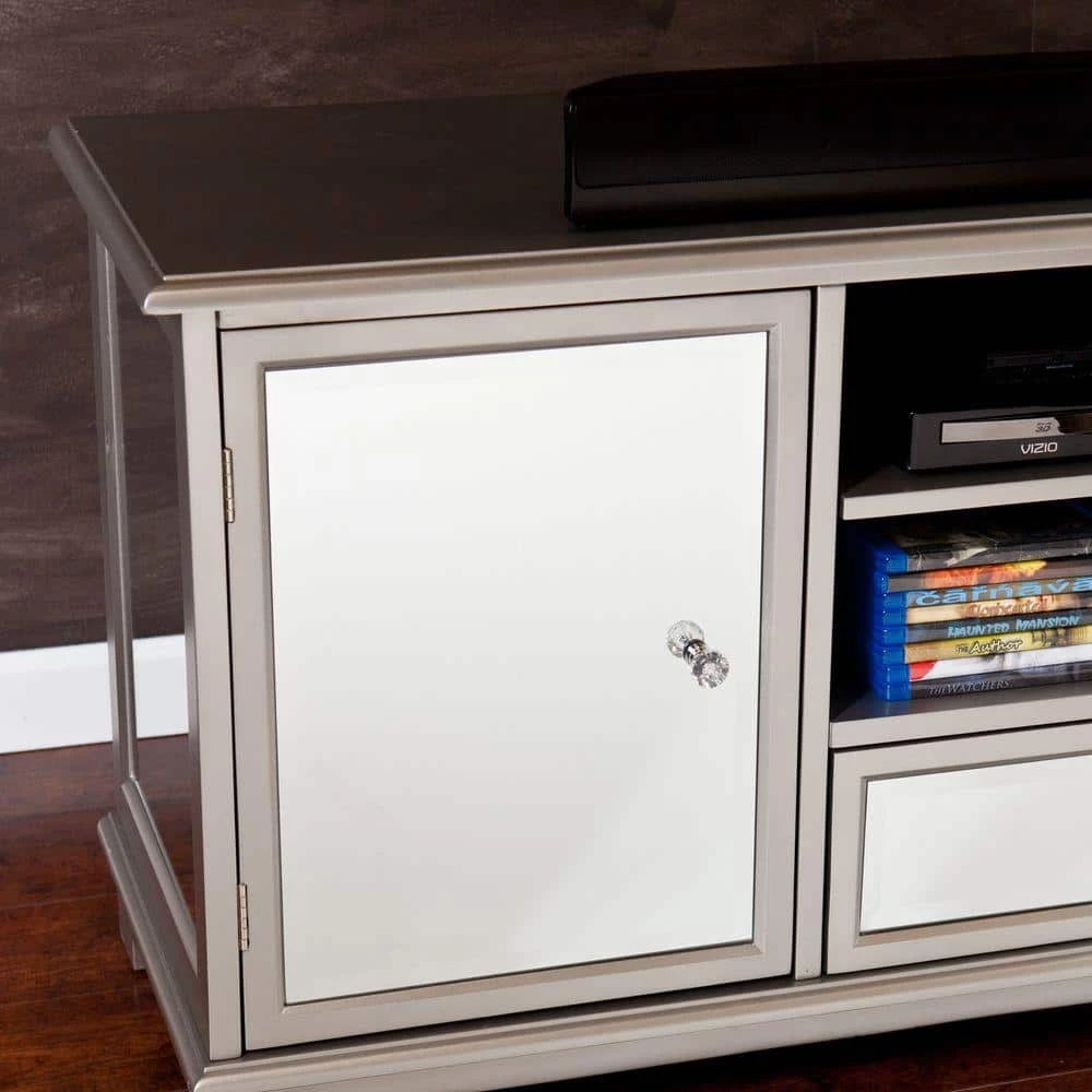 Add some allure to your living room with this glamorous, mirrored media stand. Silver painted finish, beveled mirror accents and crystal style knobs create a contemporary look that brightens any room. Ample storage includes one drawer, open center area and two cabinets for housing everything from games to electronic components. This spacious media stand is the ideal entertainment solution with a chic design.