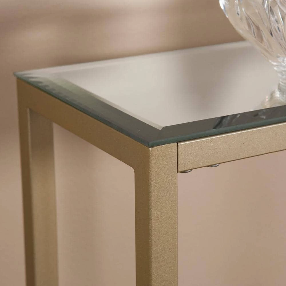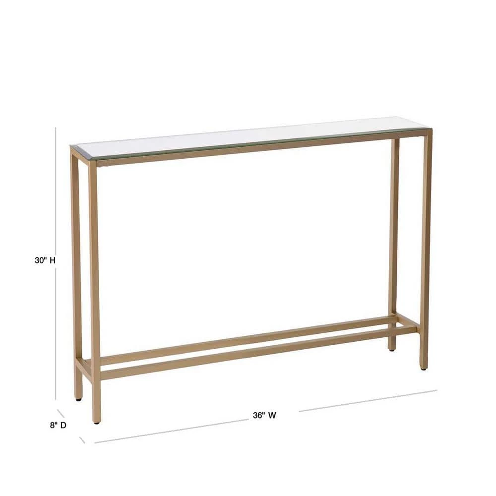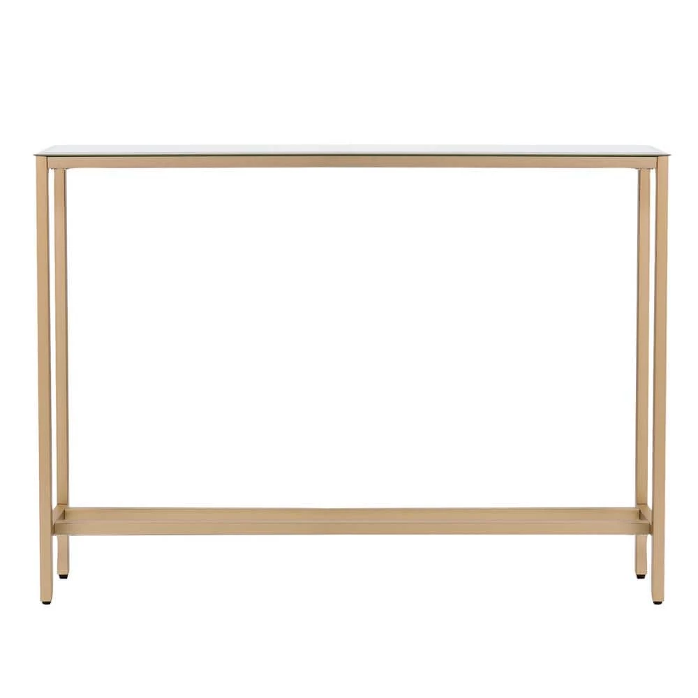 Functional furniture and decorative decor. Slender in size, this metal console does it all. Clean, metallic lines add a subtle accent to any room, complete with beveled mirror reflection. Utilize this narrow console table to display your eye-catching accessories behind the sofa, craft a hallway hub or give yourself the recognition you deserve by showcasing certifications and awards in your office space.