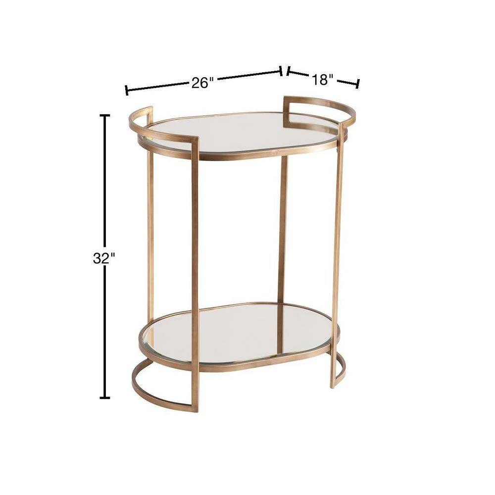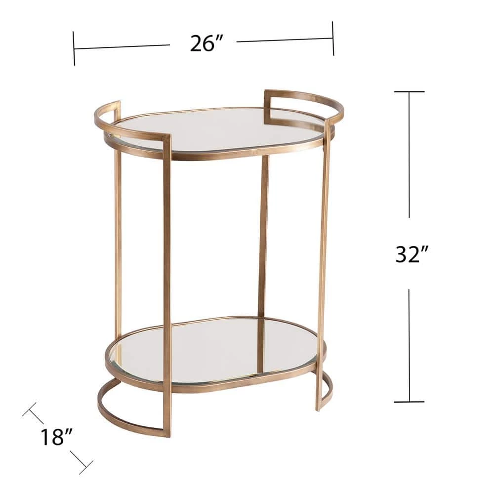 Serve up a good time anytime with this mirrored bar table.1920’s opulence waltzes in with glam gold and sparkling mirrors. Mix up a swanky brunch with mimosas and java in the dining room, bring on the ritz with a linear vase and flowers in the entryway, or serve up a posh addition to your open concept living space. The votes are in: this bar cart is the bee’s knees.