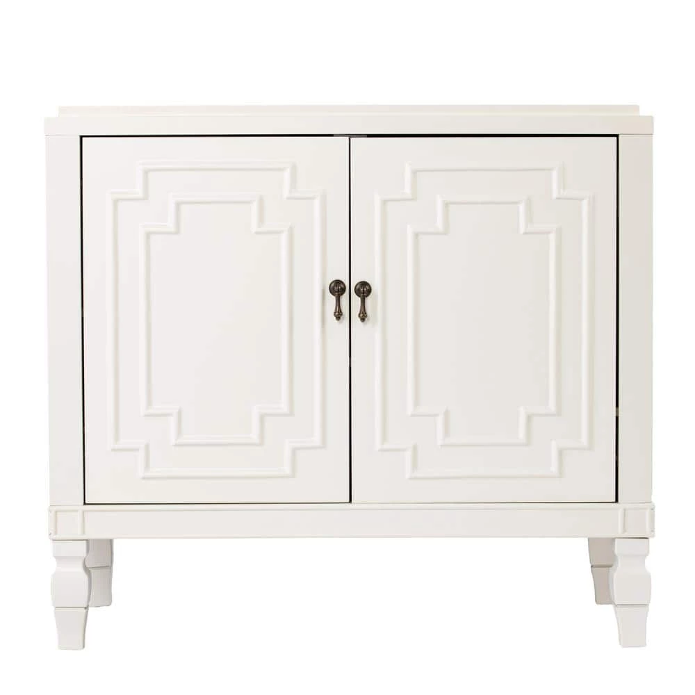 Bring functional storage to any space with this double-door cabinet. Ample shelving awaits behind handsome, traditionally carved doors, ready for your stemware, board games, or movie list. Contrasting hardware adds a touch of style to the creamy white silhouette, combining with turned legs for a classically cool look. This anywhere cabinet slides beneath a wall mounted TV or into your entryway for an instant upgrade to your space.