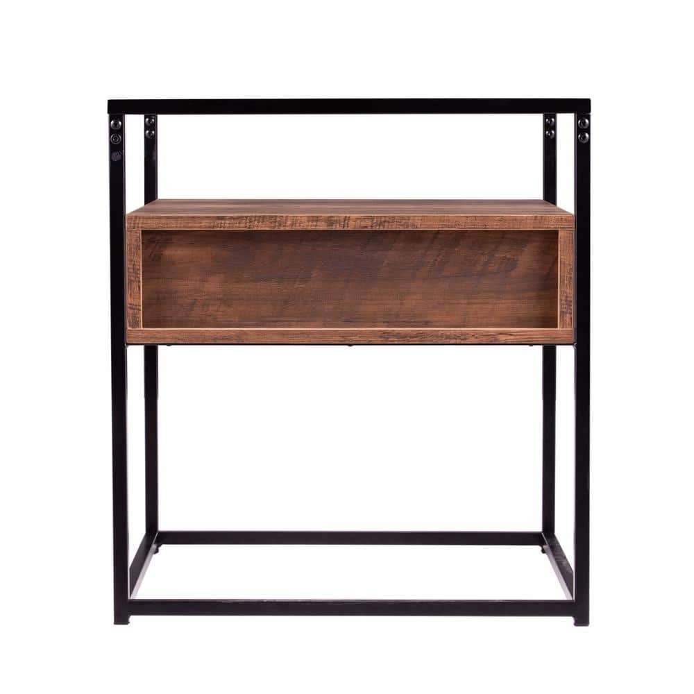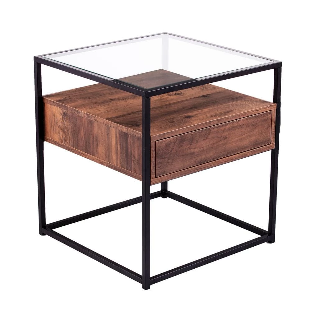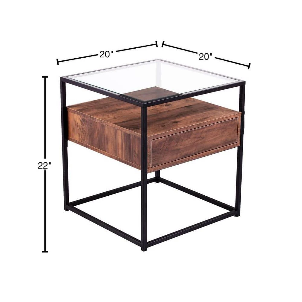 Your style floats on cloud nine with this industrial side table. A boxy, open frame crafts a light and airy look, while a convenient storage drawer rests delicately beneath a glass top. Display framed photos or flowers on sleek glass top, and store TV remotes inside the hardware-free, push-to-open drawer. Add this square accent table to your living room to organize everyday odds and ends, or nudge into your reading nook to hold your cup of tea and the latest murder mystery.